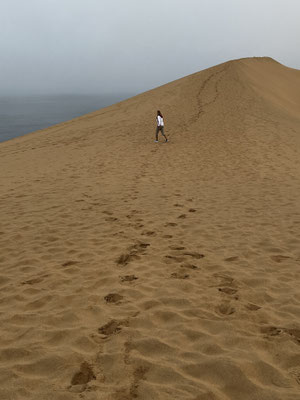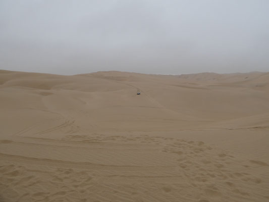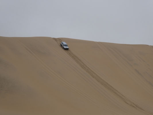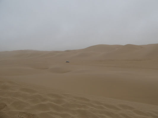 Ausgerechnet heute läßt sich die Sonne nicht blicken! Wieviel schöner müssen die Farben bei Sonne leuchten! Zwei andere Toyota folgen uns, andere Fahrzeuge haben keine Lizenz, in das Naturschutzgebiet mit seinen 120 m hohen Sanddünen einzufahren.