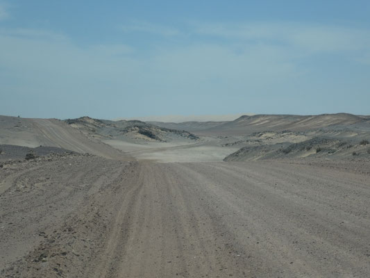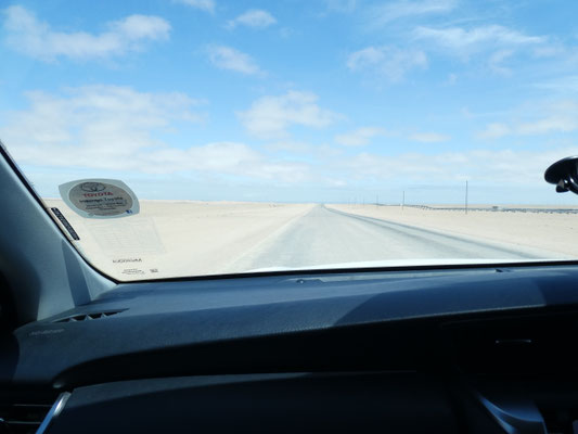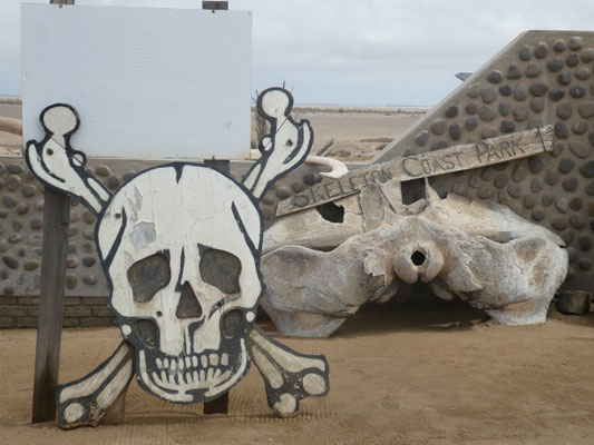 Wir spüren: das ist das Ende der Welt. Hunderte vor uns haben sich an den Wänden des Restaurants verewigt, viele empfinden das wie wir, als das Ende der Welt. Einen Kilometer weiter, Richtung Mövebucht, steht das Sperrschild: keine Weiterfahrt. Von Cape Cross bis hierher sind es 270 Kilometer, wir haben mit Pausen fünf Stunden gebraucht. Links der Atlantik, rechts flaches Gebiet, Sand mit Steinen, vereinzelt Sandhaufen mit etwas Bewuchs. Dahinter weit in der Ferne sieht es wie Dünen aus, sind aber wohl felsige Erhebungen, an die der Wind den Sand geblasen hat. Wir begegnen in der ganzen Zeit zwei Straßenbaumaschinen die die Piste glätten und drei SUV mit langen Angelruten. Entgegen aller Unkenrufe fahren wir von Nieselregen und 17 Grad in strahlenden Sonnenschein und 27 Grad. Untypisch für die Skeleton Coast, aber sehr zu unserem Vorteil.
