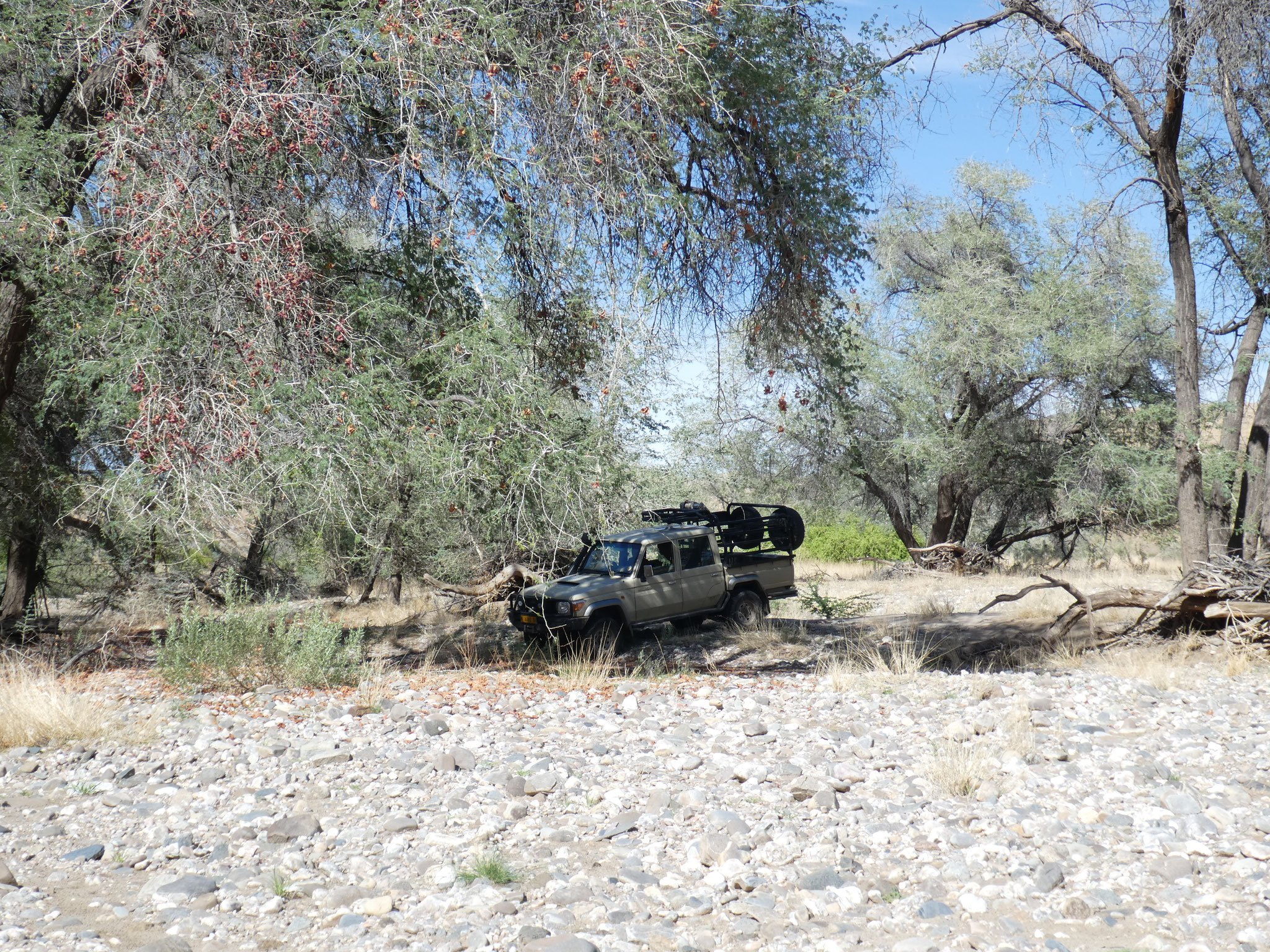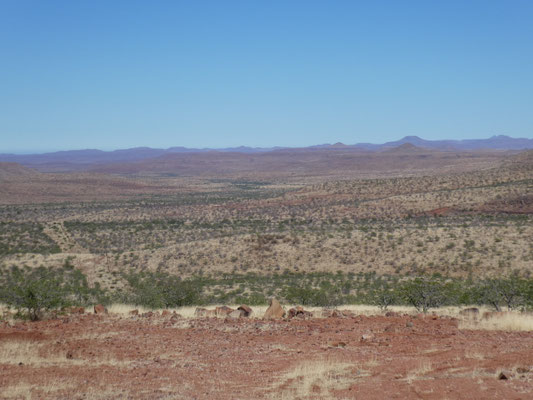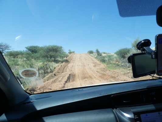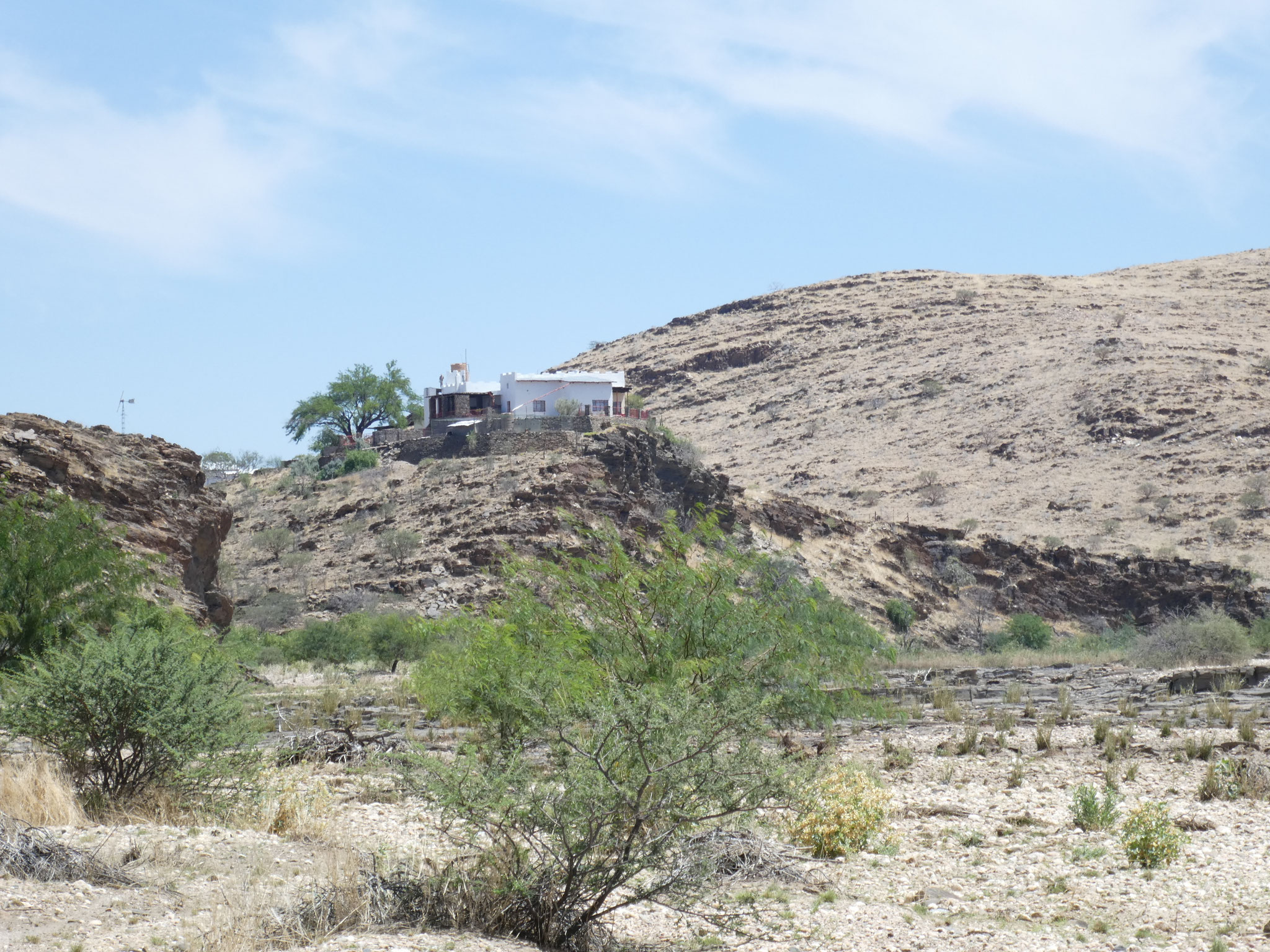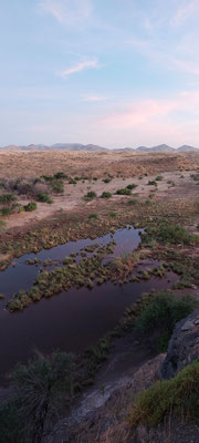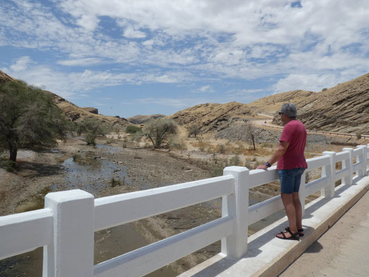 200 Kilometer über die Schotterstraße C26 über den Gamsbergpass hierher haben Spaß gemacht. 60 bis 80 km/h, am Pass 40 km/h, ganze vier Autos getroffen. Geröll frisch glattgeschoben aber verschiedene, zur Zeit trockene, Furten. Nach fünf Jahren, in denen die Regenzeit hier praktisch ausfiel, hat es dieses Jahr ein wenig geregnet, und ist gleich versickert. Bei richtiger Regenzeit werden einige Furten nicht passierbar sein. Die Lodge hat Wasser, über eine 7 Kilometer lange eigene Pipeline, aus einem 230 Meter tiefen Bohrloch von dem niemand weiß, wann es mal trocken fällt. Die letzten Zebras und Warzenschweine sind hier 2021 gesichtet worden.