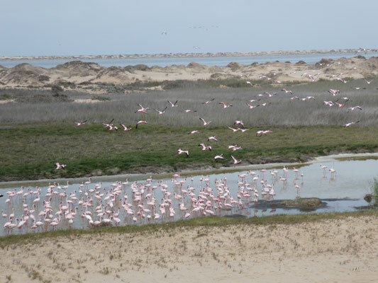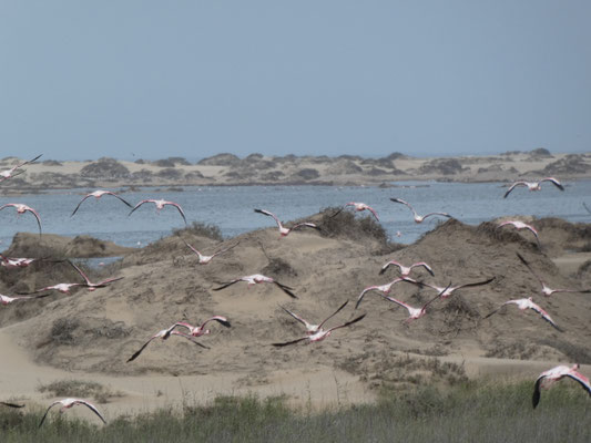 Die Flamingo Kolonie wird erst mit der langsam durchdringenden Sonne auf der Rückfahrt so richtig schön aussehen. Aber die lange Fahrt entlang der steil aufsteigenden Dünen ist beeindruckend. Vor 40 Jahren war vor den Dünen noch ein Kilometer breites Marschland, da gab es Süßwasser Quellen, die schon die Seefahrer vergangener Jahrhunderte für sich entdeckt hatten. Jetzt bleibt zwischen Wasser und Düne gerade ein schmaler Fahrstreifen.