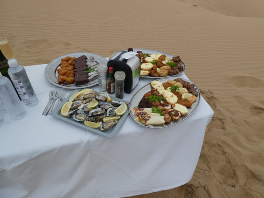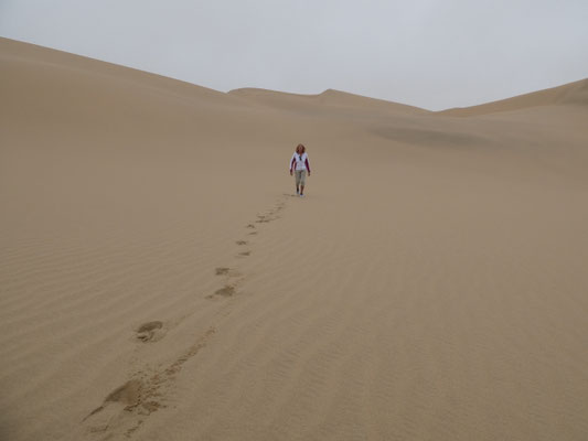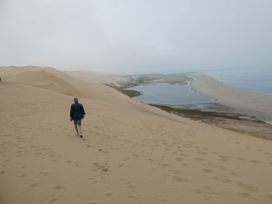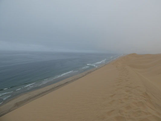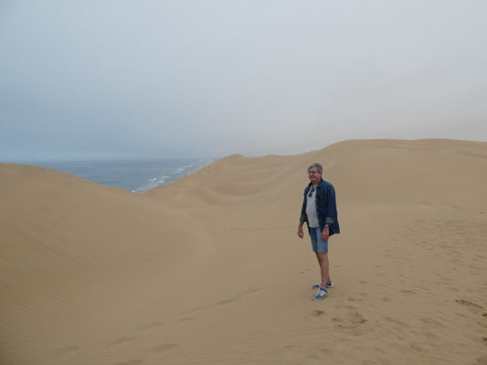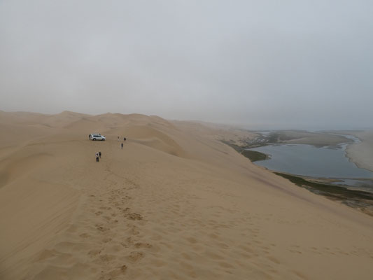 Gut, dass wir gerade Ebbe haben, sonst wäre auch dieser Streifen überflutet. Nach einer Stunde geht die Fahrt rein in die Dünen. Ein Meer von Dünen, das wir durchfahren können und damit im wahrsten Sinne des Wortes begreifen können. Bei der nahezu senkrechten Abfahrt von einer der 120 m hohen Dünen in ein Dünental erleben wir die Dimensionen körperlich. Intensiver als die immer wieder hier ausgelobten Dünen von Sossusvlei, in die man hineinlaufen kann, aber dabei immer nur einen kleinen Ausschnitt erlebt. Dort bei 40 Grad, hier bei 20 Grad.