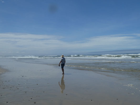 Nachmittags erkunden wir die entgegengesetzte Richtung nach „Möve Bay“. Das endet nach einem Kilometer am Schild „Durchfahrt gesperrt“. Also biegen wir wieder zum Strand ab, beobachten wie sich die tosende Brandung an Felsen vor uns bricht und sich über uns Schäfchenwolken dekorativ am Himmel versammeln.
