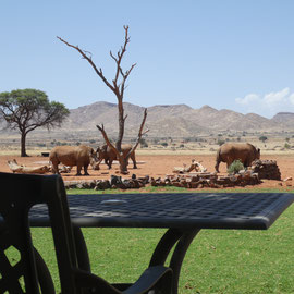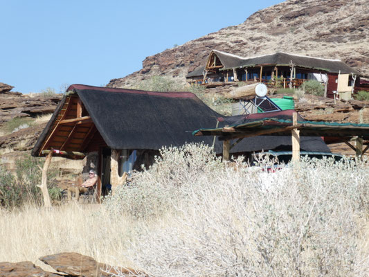Um die Palmwag Lodge herum stehen tatsächlich Palmen. Daneben sehen wir Schilf, Büsche, grünes Gras. Das Ganze wirkt wie eine Oase, mitten in der kargen Landschaft mit wenig Bewuchs. Obwohl, auf den letzten Kilometern hielt uns Oubaas noch einmal an, um uns seine Farm zu zeigen. So 30 Ziegen und ein paar Kühe. Er ist sichtlich stolz auf seinen Besitz. Ich höre auch die Botschaft an den Weißen: Wir sind nicht blöd, wir haben unser eigenes wirtschaftliches Auskommen. Das geht, weil die Farm einen 200 - 300 Meter tiefen "Brunnen" hat, aus der ein Windrad kontinuierlich Wasser fördert.