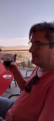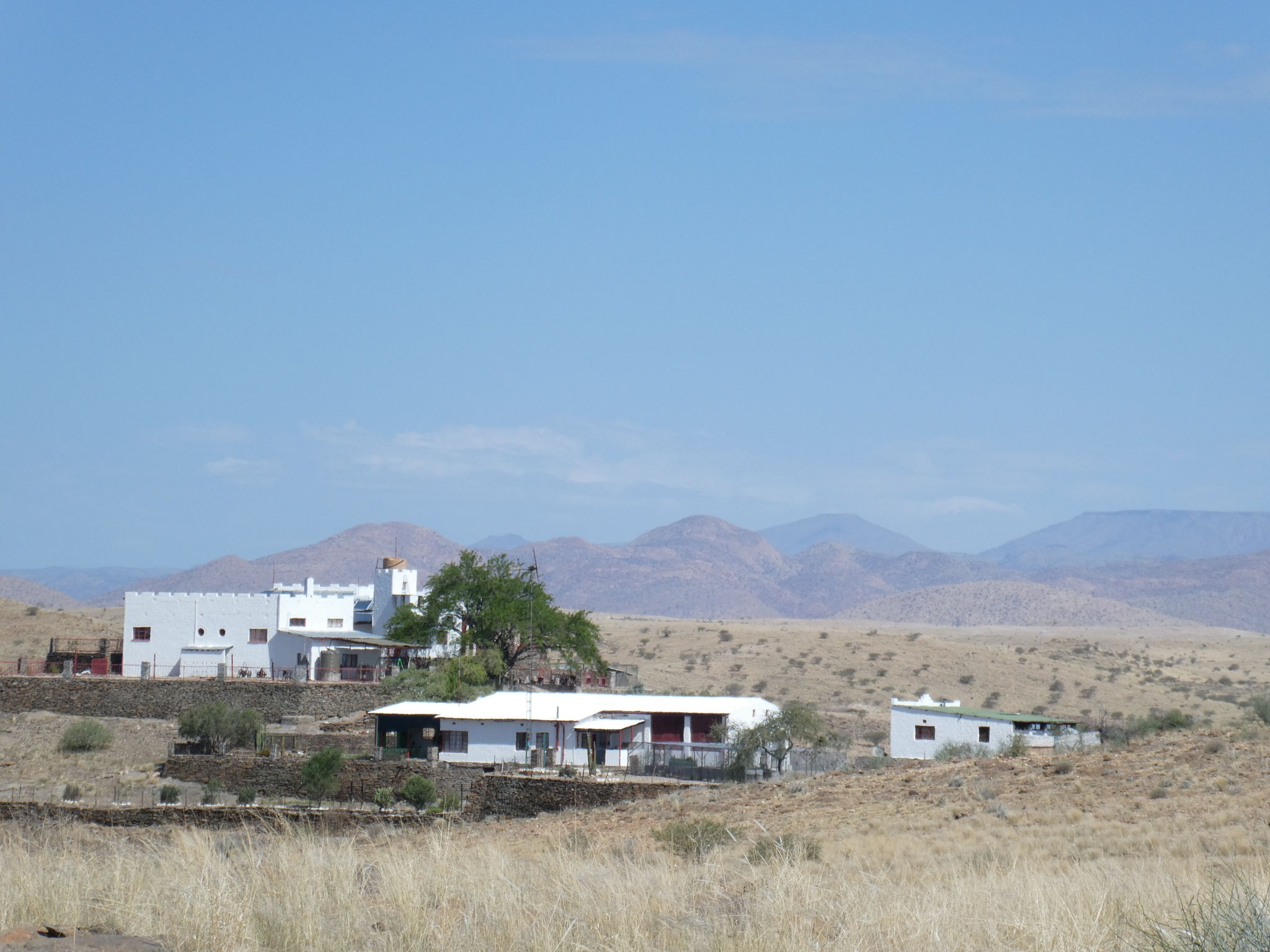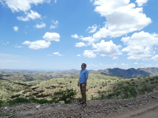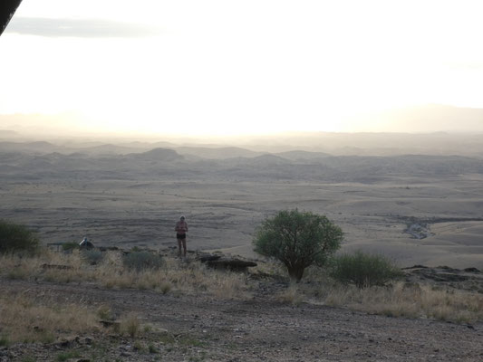 Also alles nur Weltuntergangsstimmung in der namibischen Einsamkeit? Wir können die Härte der Lebensbedingungen nachempfinden. Aber was dominiert ist die Freude darüber, solche einmaligen Stimmungen hier erleben zu können. Gesellschaft auf der Veranda der Lodge, hoch über der Umgebung, Blick in eine unendliche Weite und die sich ständig verändernden Schatten der Berge vor der untergehenden Sonne. Die Ruhe der Landschaft vor uns, unter uns. Das Bläken der Schafe. Die unverkampfte Freundlichkeit der Menschen. Und die Direktheit der Botschaften: warum reden wir heute Abend über Politik, wo wir doch dieses Stück unverbrauchter Natur vor uns haben und still geniessen können.