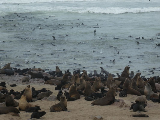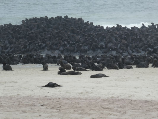Für 20 € Eintritt kommen wir in das Naturschutzgebiet rein. Wir sehen nichts als Sand und Steine und dahinter den Atlantik. Dann, bei genauerem Hinsehen, sind vor uns lauter Seehunde! Und als wir aussteigen, kommt auch Bewegung in die Seelöwenkolonie (Ohrenrobben). Überwältigend! Da müssen tausende von Tieren an Land sein und noch einmal tausende im Wasser.