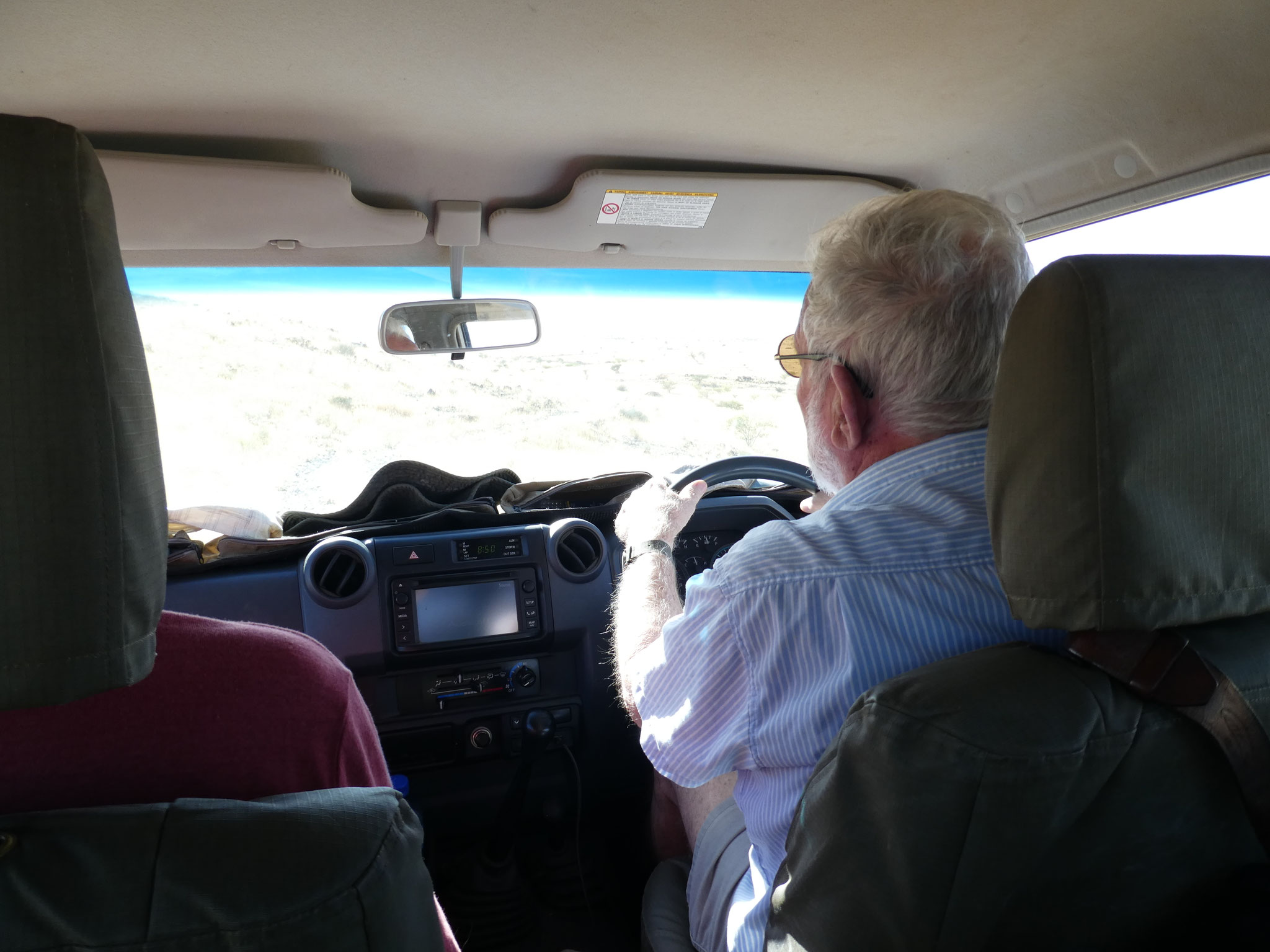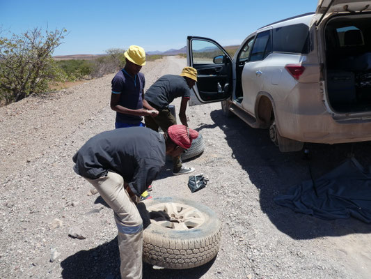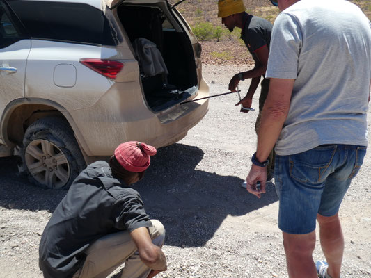 Reifenwechsel bei einem Toyota SUV ist schon was anderes als bei den mir bislang geläufigen Fahrzeugen. Der Toyota Fortuner ist in Namibia sehr häufig anzutreffen, Oubaas kennt ihn und macht sich an die Arbeit. Ich bin peinlich berührt und erkläre Jakobus, warum ich mich nicht an den Reifenwechsel rangewagt habe. Kein Problem, sagt Jakobus, die Rolle der älteren Männer hier sei es, strategische Entscheidungen zu treffen, Verantwortung zu übernehmen. Die Rolle der jüngeren Männer sei es, die Arbeit zu übernehmen. Und die Rolle der Frauen, ergänze ich. Da sind wir uns lachend sofort einig. Nach knapp einer halben Stunde ist alles erledigt. Bei der Verabschiedung sagt Jakobus irgendwas wie "gute Weiterreise Papa". Wie alt bist du, Jakobus? 54. Na super, dann könnte ich ja tatsächlich dein "Papa" sein, ich bin 72. Und Ruth ist in diesem Szenario die Mama, die die Familie zusammenhält, stellt Jakobus fest. Na, dann hätten wir kulturell alles geklärt. Wir verabschieden uns lachend voneinander. Uns ist ein grosser Stein vom Herzen gefallen, aber der Schock hängt uns noch in den Knochen.