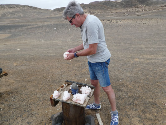 Abseits von der Straße sind drei Betriebe, die Salz gewinnen. Salzkristalle stehen am Wegesrand zum Verkauf. Sind zerbrechlich; wir versuchen, so ein Gebilde nach Hause zu bekommen.
