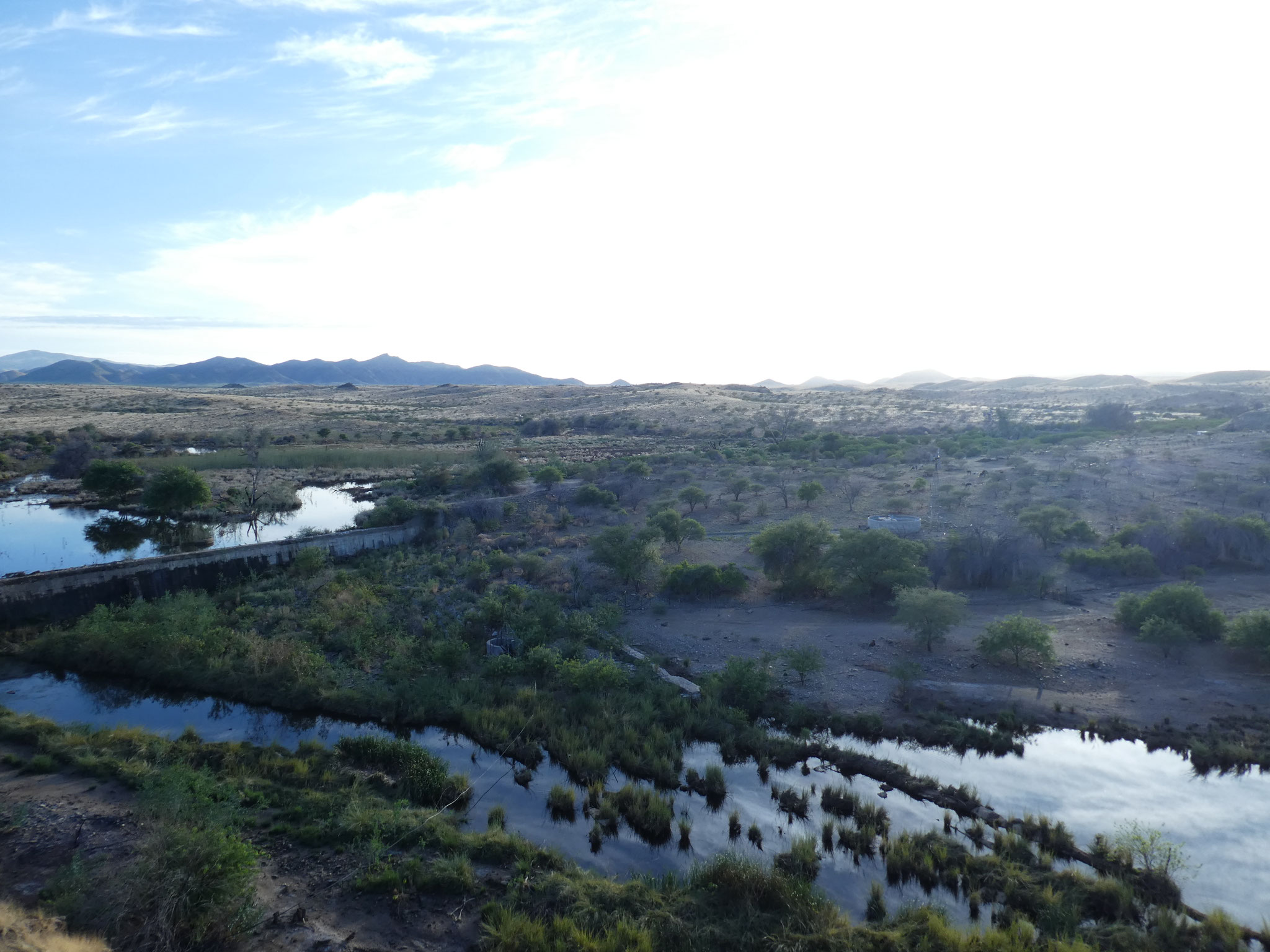 Das karge Land gibt nur noch Nahrung für eine kleine Zahl von Nutztieren her. Zufüttern ist nicht wirtschaftlich. Das Wasser wird aus 40 Metern hochgepumpt. Wenn man aber aus einem Bohrloch zu viel Wasser entnimmt, gibt die angebohrte Wasserblase irgendwann mal kein Wasser mehr her. Hinter dem Staudamm an der Farm sehen wir einiges Wasser, aber der Stausee ist nur ein Meter tief, er ist verlandet.