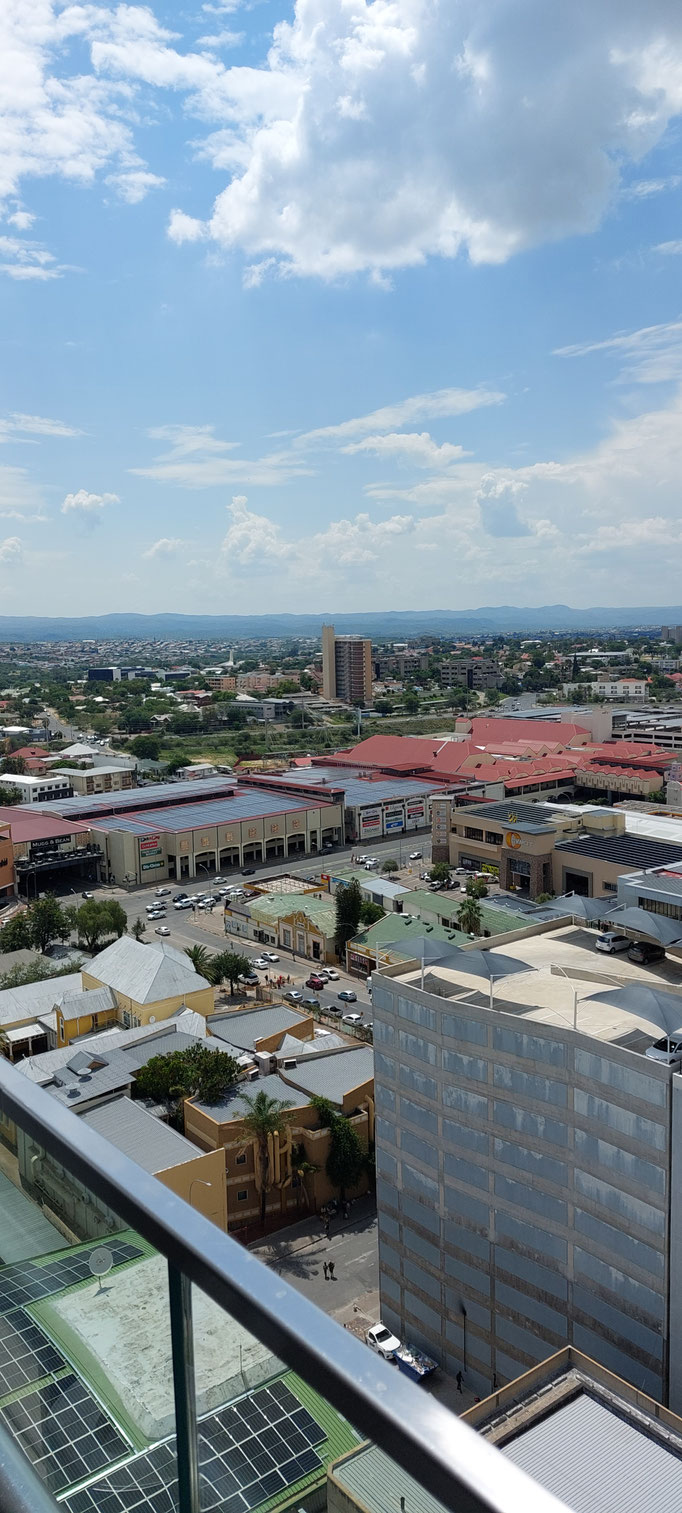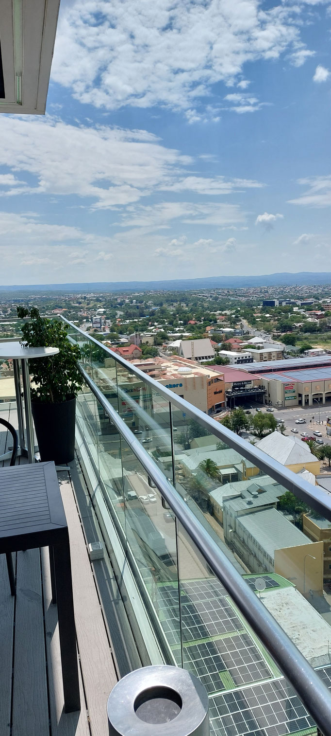In der Märzausgabe des "Süd-Afrika Magazins" finden wir eine begeisterte Reportage über das heutige Windhoek. Dort wird die Dachterrasse im 15. Stock des Avani Hotels erwähnt. Die probieren wir mal aus. Was für eine tolle Aussicht auf die Stadt! Reichhaltige Getränkekarte, einige wenige Snacks. Die Hühnchen Teile mit gebackenen Kartoffelspalten sind sehr geschmackvoll zubereitet. Eine schöne Erfahrung. Und ein Gegenpol zu den bislang eher enttäuschenden Erlebnissen hier. Mal sehen, wohin uns einige andere Tipps aus dem Magazin noch führen.