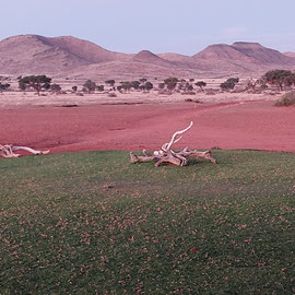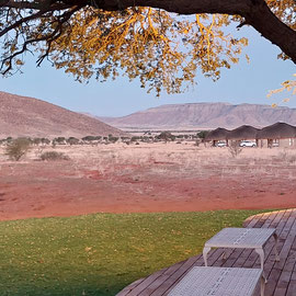 Die Namibs Valley Lodge liegt auf halber Höhe an einem Berg. Vor uns ein 180 Grad Ausblick. Grandios! Wir blicken auf Hügel wie Dünen, dahinter höhere Berge, alles praktisch ohne Bewuchs. Dementsprechend bewegt sich nichts im Wind, der uns um die Ohren pfeift. Sieht aus, wie eine tote Mondlandschaft. Aber dann, so kurz vor acht, was für ein Farbenspiel am Himmel, von Tiefblau bis Oker. Die Berge erscheinen jetzt wie auf einem impressionistischen Gemälde in der warmen, diesigen Luft.