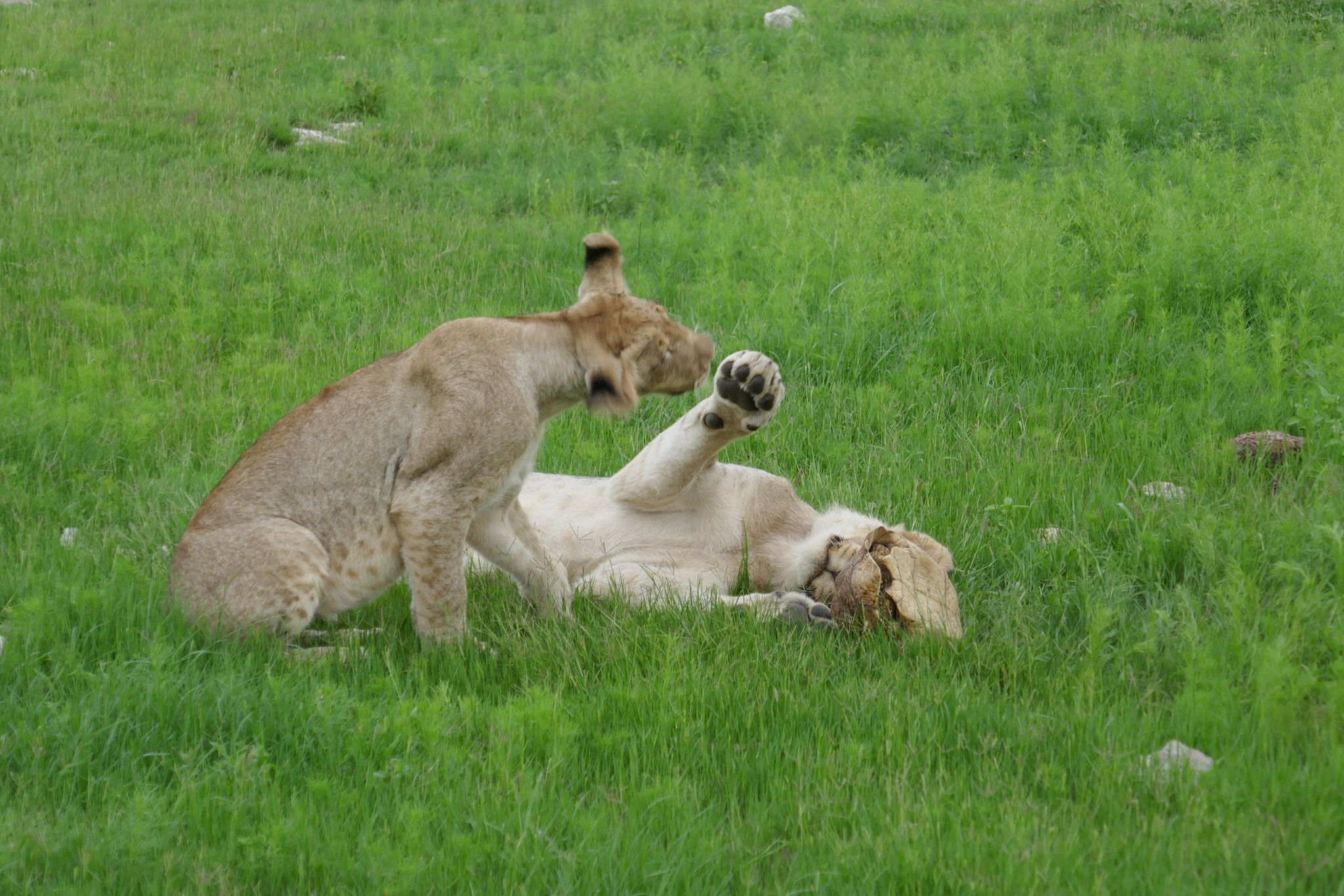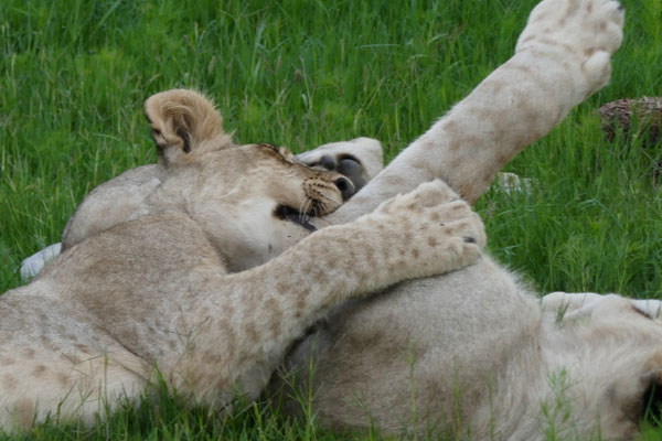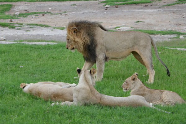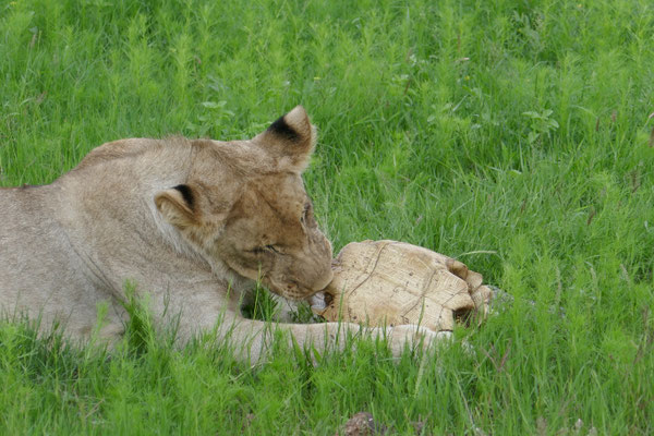 Unser Fahrer findet gleich zu Beginn eine Löwenfamilie und wir haben ausreichend Zeit, Vater, Mutter und ihre zwei Jungen zu beobachten. Die Jungen spielen mit dem leeren Panzer einer Lederschildkröte, den sie gern aufbeissen würden, geht aber nicht, zu hart. Vater schleicht um Mutter herum, es scheint die richtige Zeit zu sein, aber so einfach ist sie nicht zu haben. Na gut, nach einer angemessenen Werbeperiode darf er.