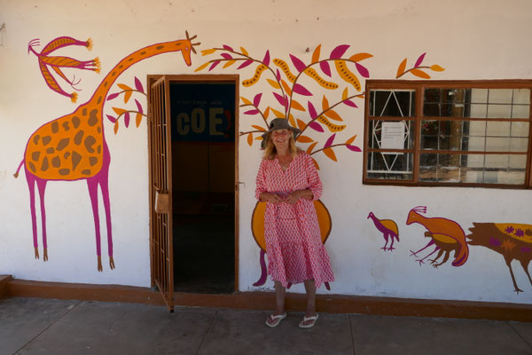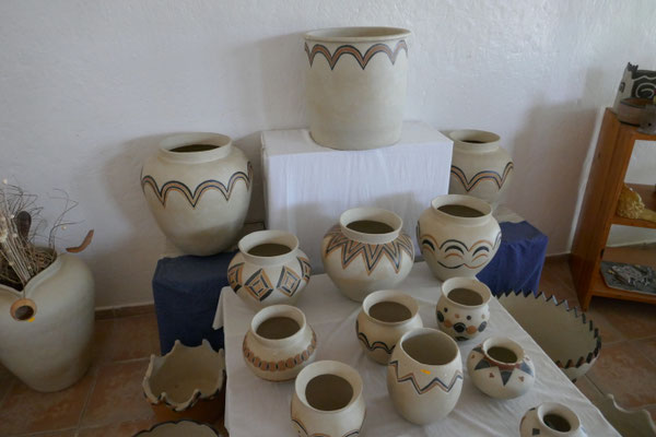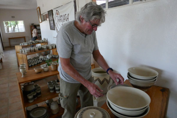 Vor unserer Weiterfahrt am Rande der Kalahari Wüste entlang besuchen wir die Thamaga Pottery. Irgendwo versteckt im Dorf Thamaga gelegen, nach dreimal fragen gefunden. Die Töpferei wurde in den 70iger Jahren von Bewohnern aus Thamaga mit Hilfe römisch katholischer Missionare gegründet. Non profit organisation. Die verwendeten Muster sind traditionelles Tswana Design, in dem Fußböden und Außenwände der Lehmhütten dekoriert wurden. Die Qualität ist Steingut, ein paar Stücke kaufen wir.
