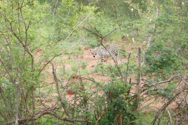 Auf den morning game drive verzichten wir, die Nacht hat’s geregnet, jetzt am frühen morgen immer noch, da ü+berhören wir gende das Weck-Klopfen und schlafen genüßlich weiter. Nachmittags wieder ein langer game drive durch den Park. Mit Regenjacke und Regendecke, denn zwischendurch kommt immer mal ordentlich was runter. Unter den wasserabwseisenden Decken wird es kuschelig warm, der Regen kann uns mal. Am Staudamm im Norden liegt ein einsames Krokodil am Ufer, niemand weiß, woher es kommt, über die Ansiedlung eines weiteren Krokodils wird nachgedacht. Etwas weiter, unter einem Busch ein Leopard. Steht auf und zeigt sich und sein Fell in ganzer Schönheit. Was für ein Anblick.
