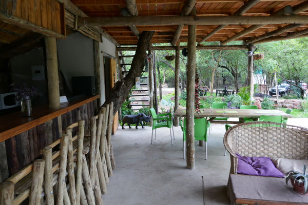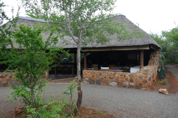 Die letzten zehn Minuten bis zum Moselha Bush Camp fährt uns ein Fahrer im Geländewagen, am Camp werden keine Gästefahrzeuge geparkt. Routinierter Empfang durch die Campmanagerin aus Johannisburg, die immer drei Wochen hier ist, dann eine Woche Urlaub in Johannisburg.