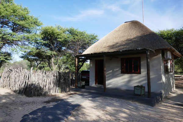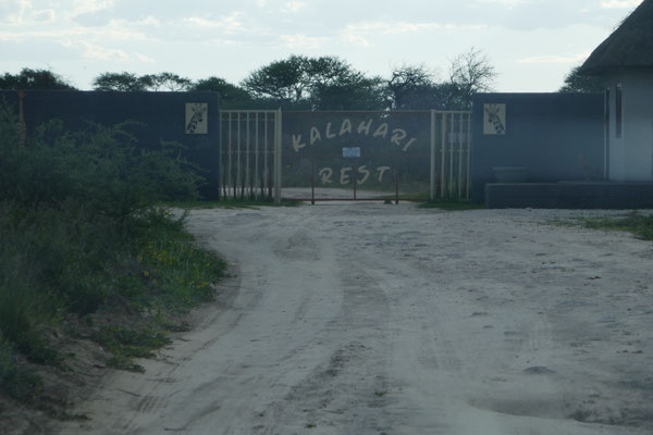 Nach 150 Kilometern ein kleiner Ort, Einkaufszentrum, Schnellrestaurants, Pause. Nach drei Stunden beziehen wir im Kaglagadi Rest, abseits des Highway, eine Hütte. Das Camp ist weitläufig, in die Tage gekommen, sehr gastfreundlich mit guter Küche. Wie auf unserer ECO Farm neulich auch hier Warmwasserbereitung in einem Behälter mit Holzbefeuerung drunter, allerdings mit Wasseerleitung in unsere Hütte hinein.