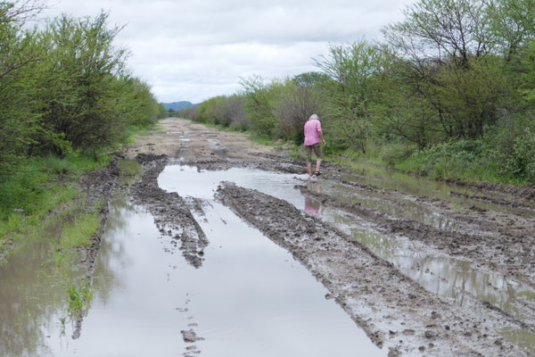 Das Schlimmste haben wir gepackt, wir brauchen nicht umzukehren und setzen die Fahrt auf der Schotterstraße fort. Ein paar Kilometer später doch wieder so ein Schlamm-Wasser-Loch. Das wiederholt sich noch so zehn Mal. Und bei einigen Durchfahrten steigert sich die Menge an Schlamm und Wasser.