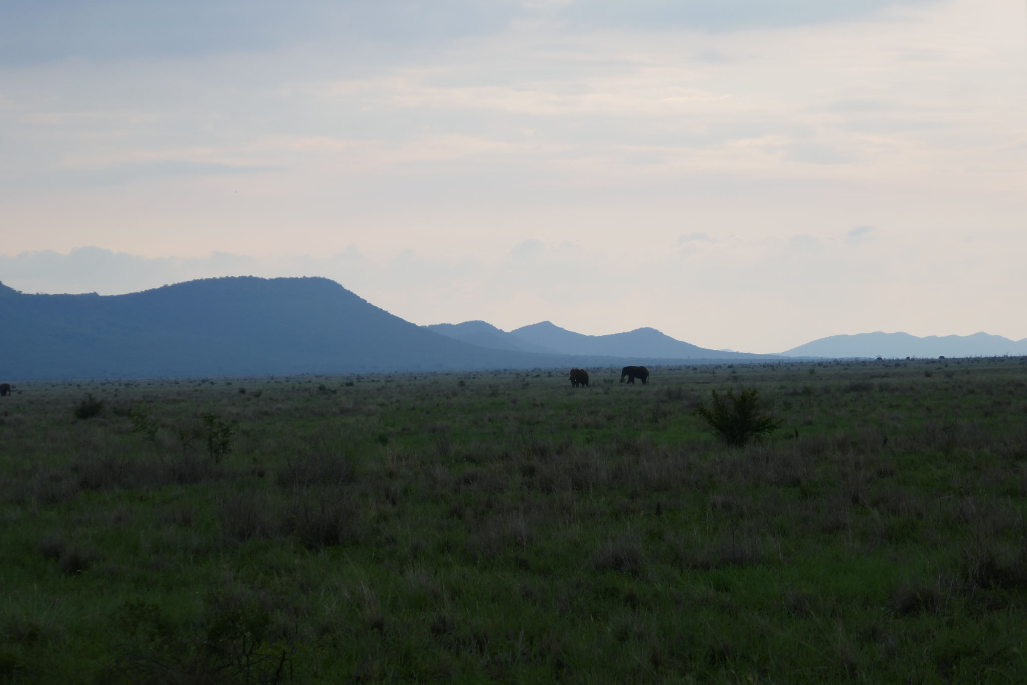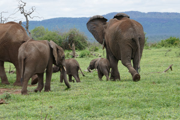 Die Elefantenherde ein Stück weiter hat schon ganz jungen, vielleicht zwei Monate alten Nachwuchs. Der Rüssel des kleinen Elefanten schlackert noch unbeholfen hin und her, bekommt kaum einen Grashalm zu fassen. Hochheben zur Brust der Mutter klappt ohne Probleme, ist viel einfacher. Nach vier Stunden und einer Pause kommen wir in der Dunkelheit zurück.