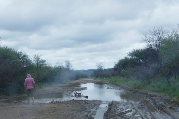 Als wir später mal wieder Internet haben, finden wir eine feinsinnige Nachricht von unserem heutigen Reiseziel, des Moseltha Bush Camp, die wußten, aus welcher Richtung wir kommen: "Did you manage to check with the accommodation about the route you will be taking? There have been a few issues with roads due to the rein, so wanted to check how you're getting on". Nun, mit Ras en Rus hatten wir geredet, die sagten teilweise blöde Stellen, aber machbar. Und ja, durchgekommen sind wir.