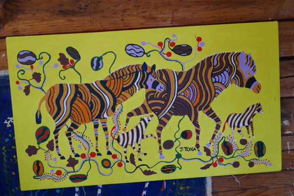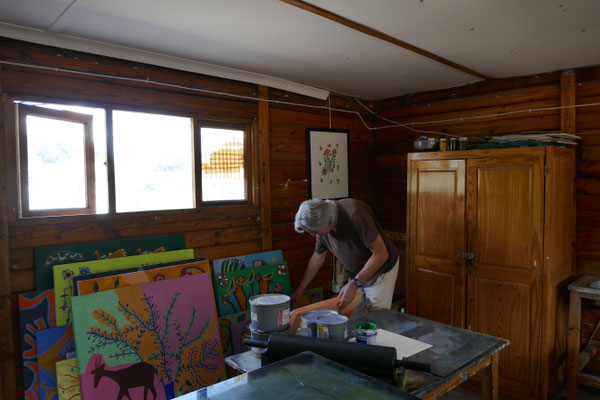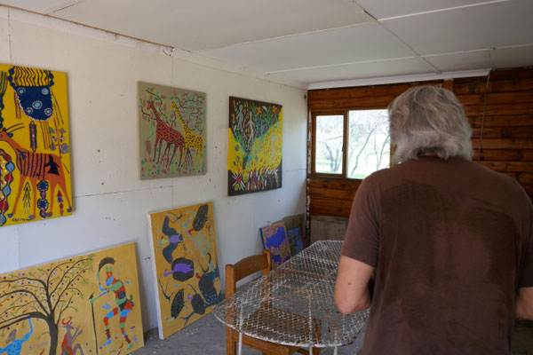 Auch das Museum wird bei Bedarf geöffnet. Wir schauen uns eine Vielzahl fahrbenfroh gemalter Bilder mit Tieren, Pflanzen, Menschen aus dem Leben der San an. Ich würde am liebsten ein Bild mitnehmen, aber das würde zu Hause doch eher als Fremtkörper wirken… Im nächsten Gebäude finden wir Lithographien in sehr kleiner Auflage, schwarz-weiss, braun-weiss, wieder mit Motiven aus dem Leben der San, da werden wir fündig.