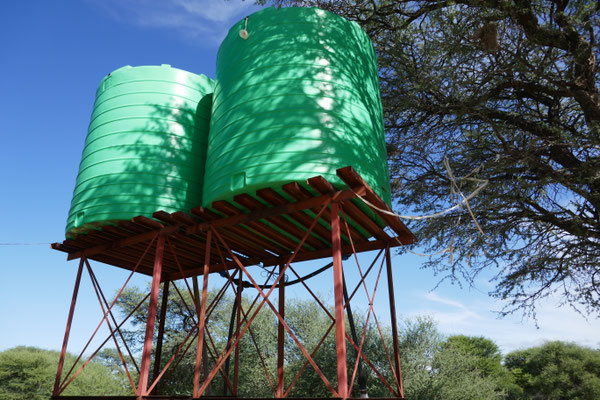 Bei genauerem Blick sind Boden, Gras und Bäume noch naß vom nächtlichen Regen. Und nach soviel Wasser will Chamberlain, unser Fahrer im Camp, prüfen, inwieweit die Wege befahrbar sind. Wir begleiten ihn zum 50 Meter tiefen Bohrloch, dort soll die Pumpe umgestellt werden. Nachts pumpt der Dieselgenerator Wasser in die Wasserlöcher, tagsüber füllt die solarbetriebene Pumpe die Wassertanks im 7 Kilometer entfernten Camp auf. Der Sandweg ist weich, aber kein Problem für den Toyota Land Cruiser, der nur an einer Stelle auf 4 x 4 umschalten muß.