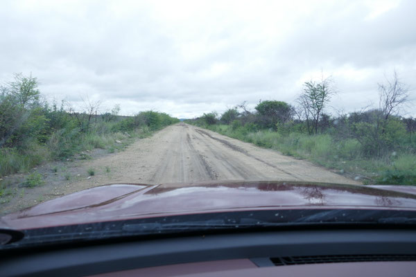 Wir beide spüren den Unterschied. Das Navi sagt 1:40 h Fahrzeit bis zum Motselha Bush Camp. Wir fahren den Feldweg bis zur Nationalstrasse mit schlammigen Pfützen ohne Probleme. Weiter ein Stück auf Asphalt, dann Abbiegen auf eine Schotterstraße. Gut zu fahren.