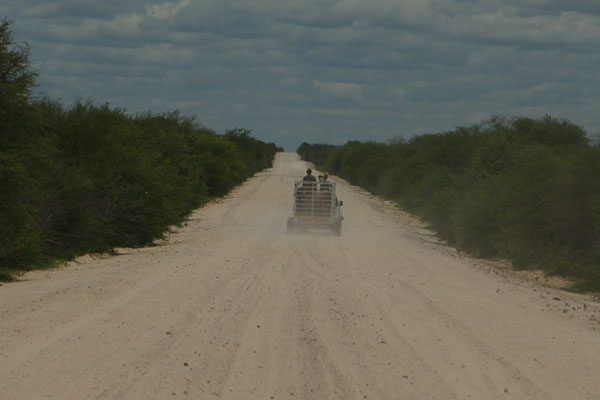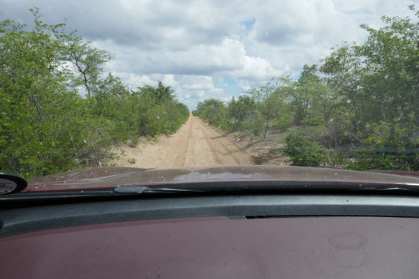 Schlaglochstrecke eine Stunde lang zurück, dann rechts ab „Dobe Border Post“, die ausgeschilderte Verbindungsstrasse von Botswana nach Namibia. Ein paar Kilometer glatte Strecke, dann festgefahrener Sand mit tiefen Wellen, Löchern und ein paar wassergefüllten Senken. Slalomfahrt um die am wenigsten rumpelige Spur zu finden, richtig Abendteuer. Die erste Stunde. Die weiteren 3,5 Stunden danach einfach nur noch ermüdend.