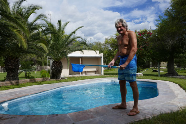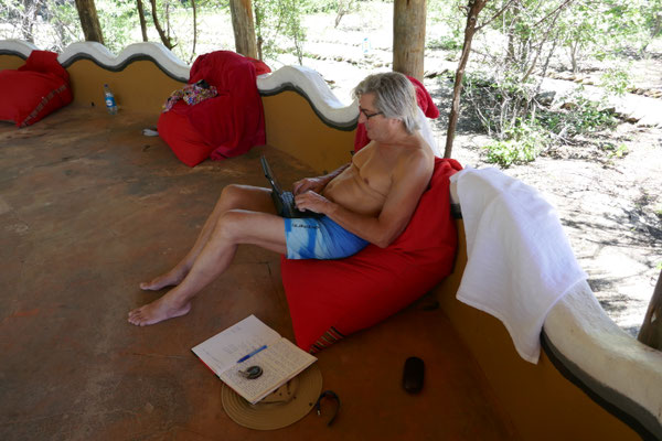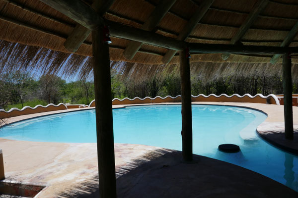 Wir sind zunächst die einzigen Gäste in der Lodge. Abends kommen zwei deutsche Motorradfahrer und drei Pick Ups, alle unangemeldet, aber Nelson, der schwarze Manager, schafft mit seiner Truppe alle gut zu versorgen. Ich brauche erst einmal eine Pause, der Kreislauf droht zu versagen, Gefühl wie beim Judo, kurz vor dem Abwürgen. Nachmittags im Pool, Wassergymnastik, eine Stunde im Camp und Umgebung herumspaziert, kein Hut, trotz bewölktem Himmel wohl viel indirekte Sonne; das war wohl zu viel. Das Gefühl hatte ich bisher nur beim Judo, nie in Afrika. Wieder was gelernt.