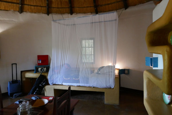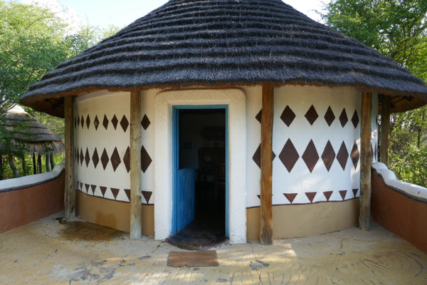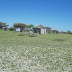 Die Sonne scheint, ein paar Wolken am Himmel, 33 Grad. Wir haben keine Lust mehr zu fahren, aber das schöne Wetter und die Abwesenheit von Regenwolken heben die Stimmung! Gweta Lodge sieht gemütlich aus, die Hütten haben Außenbad und Dusche, sind aber sehr eng und ohne Klimaanlage. Größere Zimmer sind in unansehnlichen Baracken.
