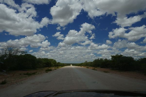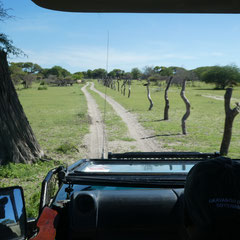 250 Kilometer bis nach Gweta, in die Mitte zwischen zwei riesigen Salzpfannen. Immer mal heftige Schlaglöcher dazwischen, lieber etwas langsamer fahren.
