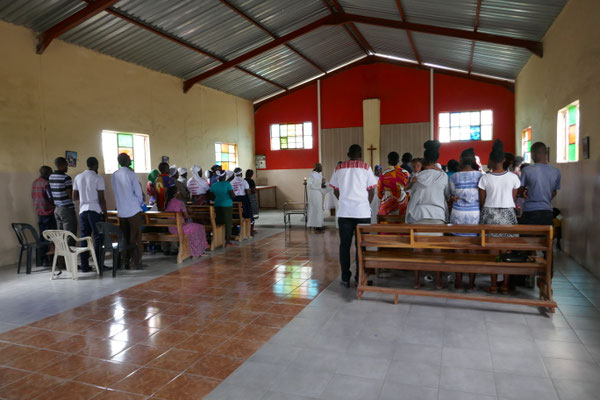Ein paar Meter weiter, schon auf dem Rückweg in die Lodge, fröhlicher, lauter Gesang. Kommt aus einem schlichten Gebäude jenseits der Strasse, ein Schild verweist auf eine römisch katholische Gemeinde. Wir fahren hin, verweilen unsicher vor der Tür und werden dann hereingebeten. Kinder spielen draussen vor der offenen Tür. In der Kirche sind alle Plätze belegt. Eine Frau liest die Predigt in Englisch, ein Mann neben ihr übersetzt in die örtliche Stammessprache. Neben dem Altar sitzen drei Frauen in weissen Talaren. Ob die die Funktion des Priesters übernehmen? Jedenfalls ist weit und breit keiner zu sehen. Danach Fragen, wo wir herkommen und wie wir nun gerade inm dieses Gotteshaus kommen. Eine Spende in den Kollektenkorb und wir fahren weiter.