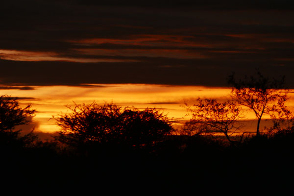 Jetzt geht es auf der namibischen Seite so richtig flott mit 60 - 70 km/h auf der gravel road weiter. Wir erreichen die Tsumkwe Country Lodge noch bei Helligkeit, haben die Fahrerei für heute so richtig satt und laufen ins Gelände vor die Lodge und lassen uns vom roten afrikanischen Sonnenuntergang inspirieren. Weil Regenzeit sind Wolken am Himmel, dazwischen in immer wieder neuen Fenstern die untergehende Sonne, ein spannendes Schauspiel. Die Farben variieren von dunkelroter Sonne bis zu zartrosa an den Schleierwolken. Unten auf der Erde wieder dieser weite, scheinbar grenzenlose Blick über die niedrige Busch Vegetation hin bis zum Horizont. Ansonsten Stille. Die Vögel haben sich in der Dämmerung schon zurückgezogen. Eine Stimmung, zeitlos, geräuschlos, bewegungslos am Boden, wild bewegt am Himmel, die sich tief in die Erinnerung einprägt.