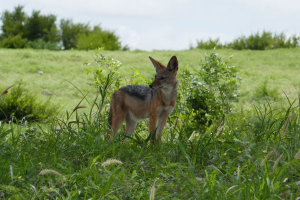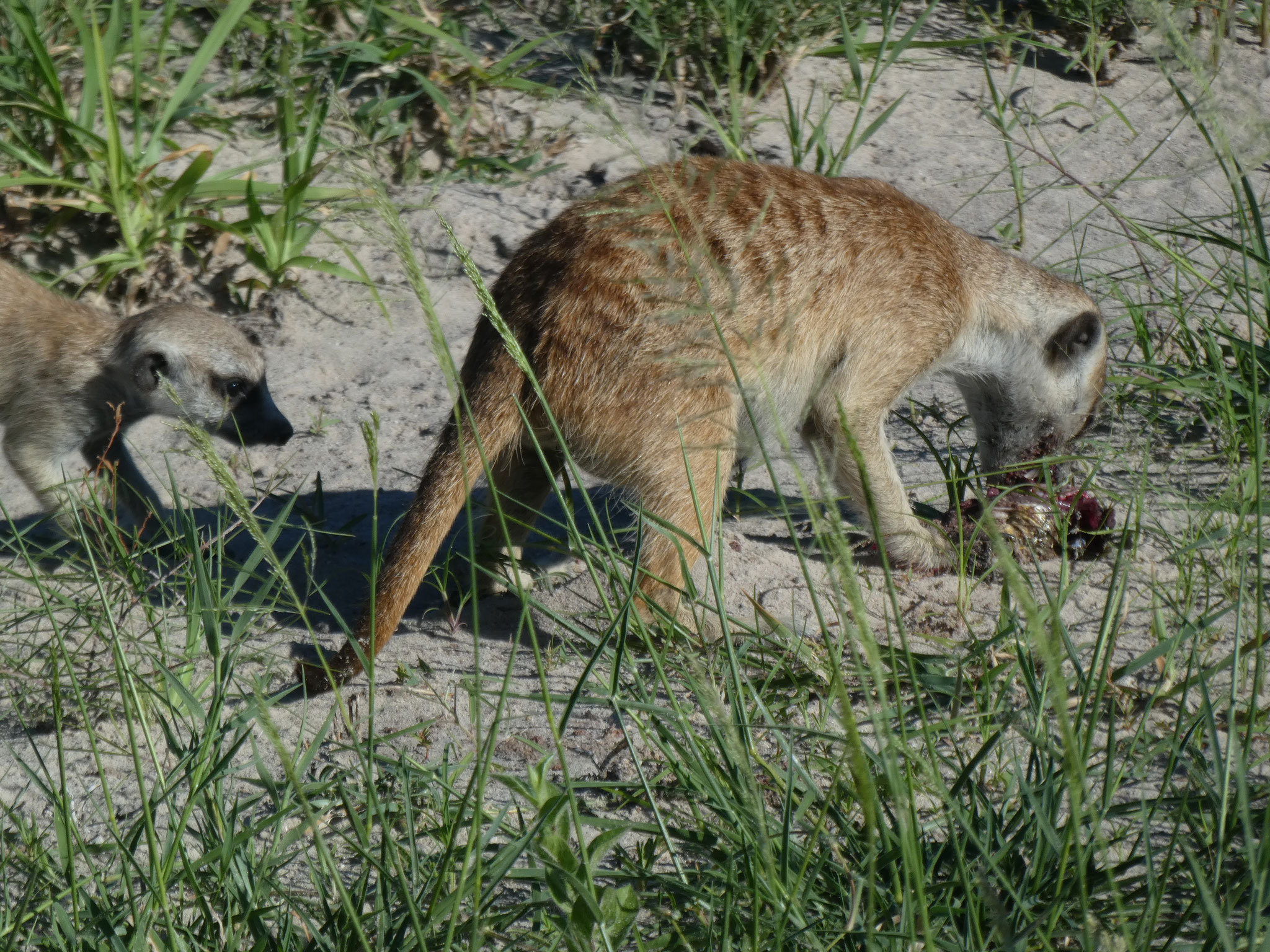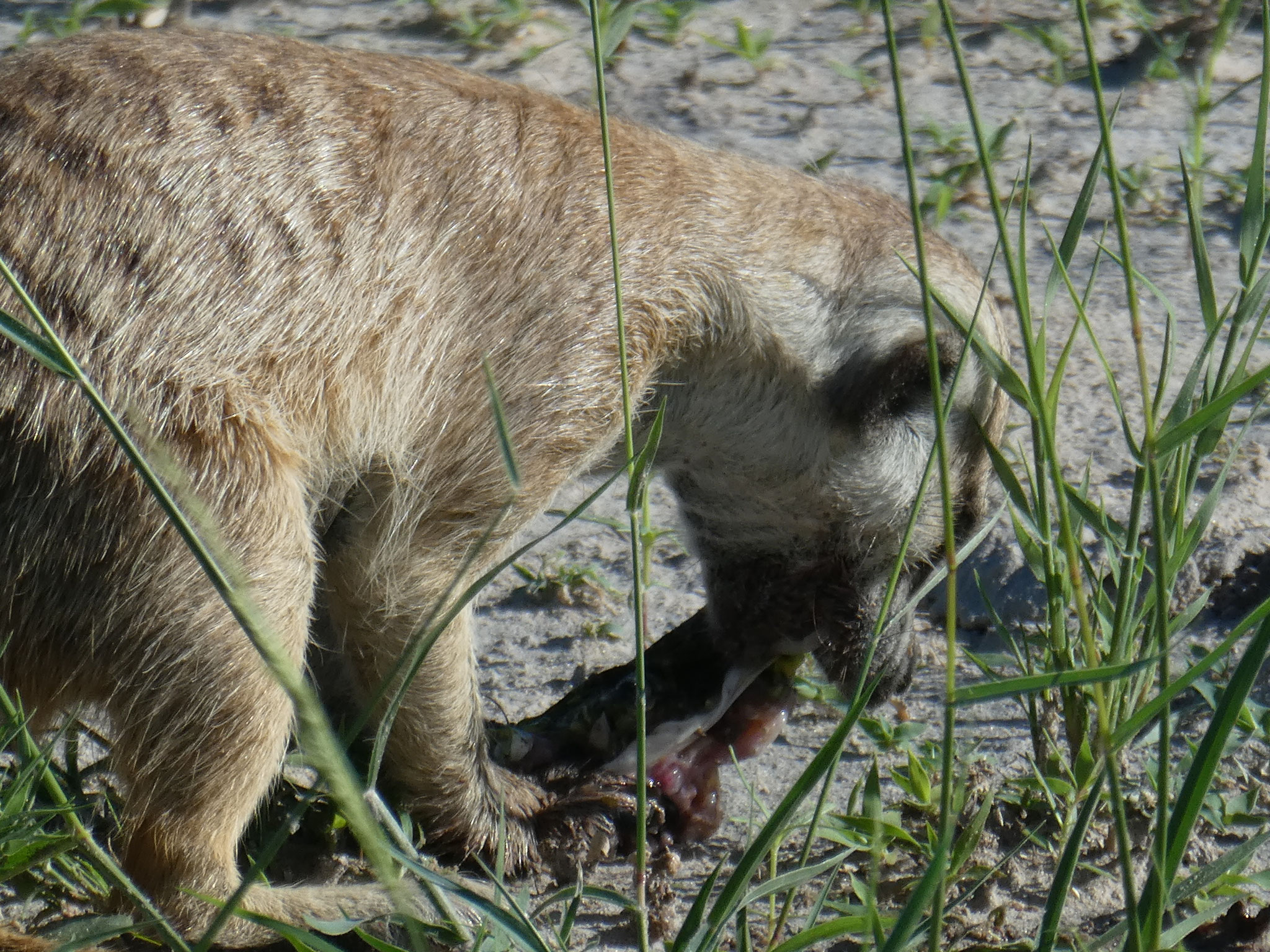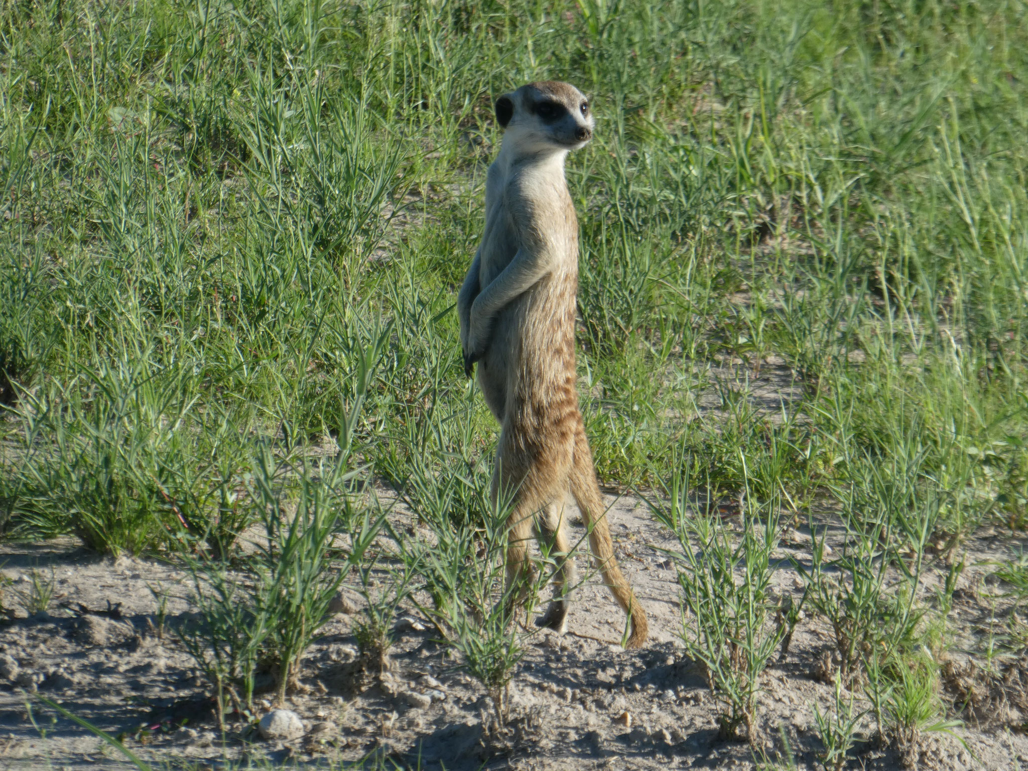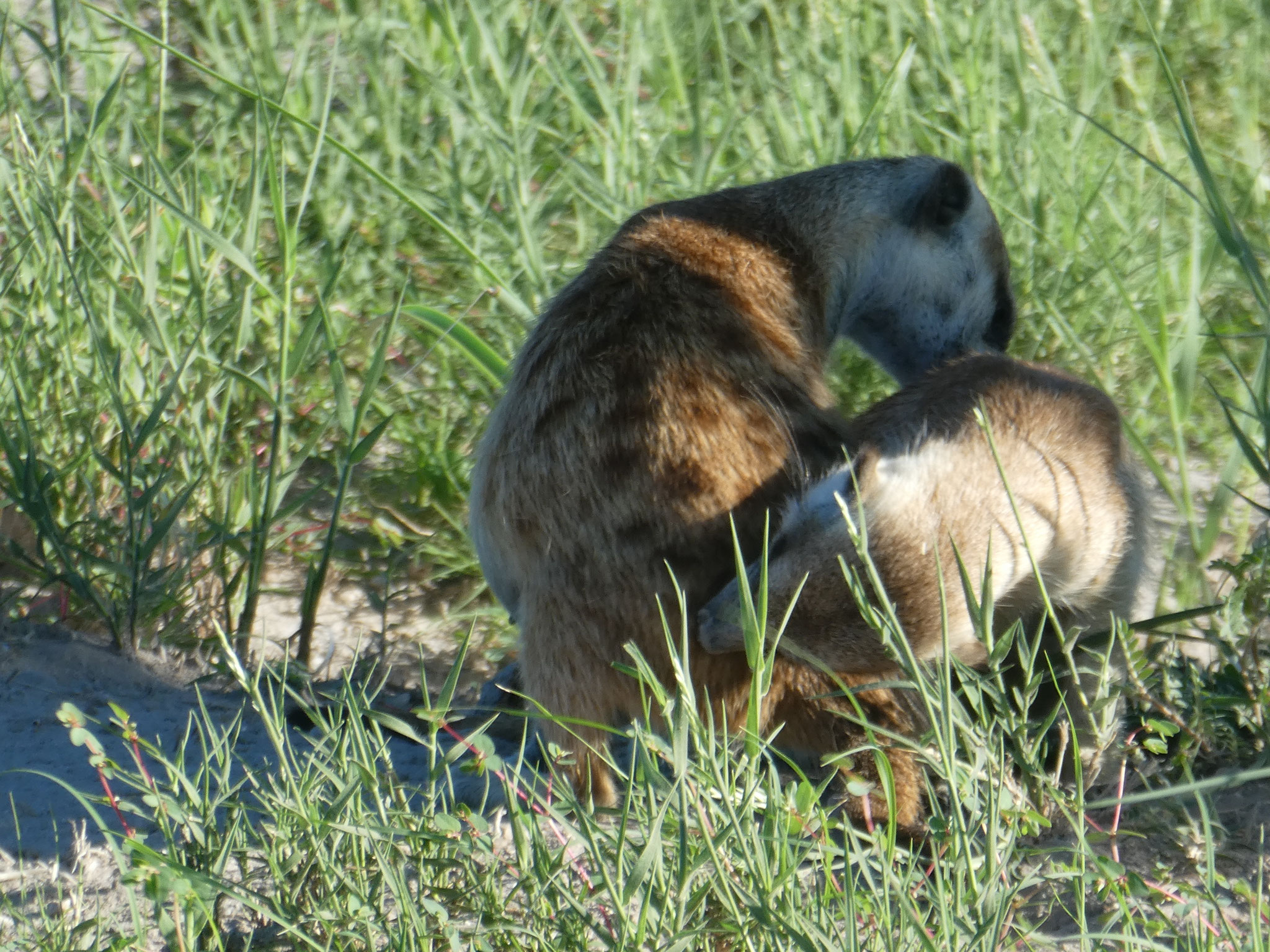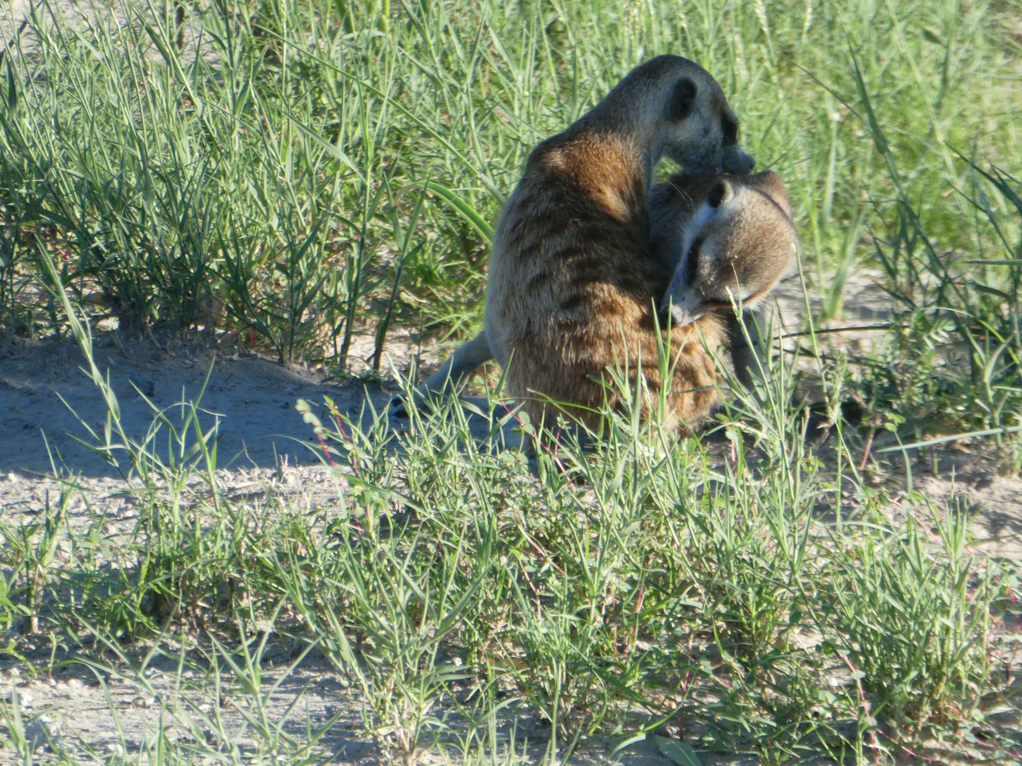 Die Erdmännchen sind in ständiger Vorwärtsbewegung auf dem Grasland, ständig am Graben, finden Insekten und Kleingetier, verteidigen eifersüchtig ihre Beute. Wir begleiten sie eine zeitlang zu Fuß. Spannend, lustig und ganz aus der Nähe. Eine sechsköpfige englische Senioren-Reisegruppe setzt gewaltige Objektive von so 30 bis 50 cm Länge zur Jagd ein.