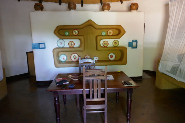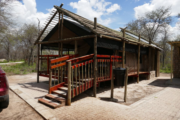 Die letzten Besucher sind gestern durchgekommen, am Empfang liegt ein Zettel: bitte 2 x Hupen. Registrierung, Parkgebühren bezahlen und 7 Kilometer weiter über eine Sandpiste bis zum Camp. Das Empfangsgebäude (und Küche und Restaurant) wurde von den jetzigen Pächtern vor zwei Jahren gebaut. Das Dach hat die Form von Elefanten Stosszähnen, wird uns erklärt, wir hatten erst an eine japanische Inspiration gedacht. Schön angelegt, schöne Aussenanlagen, alles mit einem breiten Streifen spitzer Steine vor unangemeldeten Elefantenbesuchen gesichert, die finden in der Trockenzeit das Poolwasser sehr attraktiv.