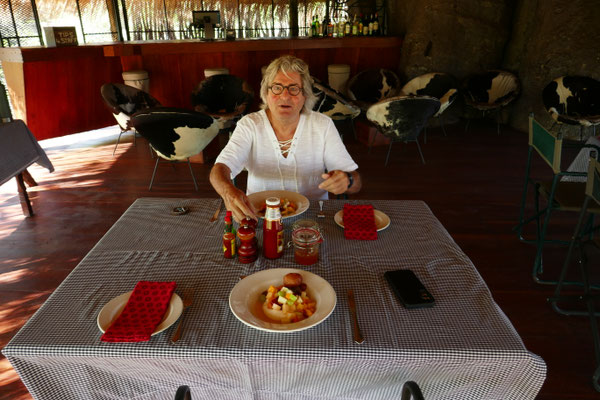 Das Fleisch erweist sich als recht zäh, ein kleiner Teil für uns, ein grosser Teil für den schon wartenden Hund vor der Terrasse. Ob der wohl seine Chance schon vorher kannte?