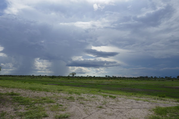 Wir fahren mit Chamberlain am Nachmittag noch einmal durch die Park. Größere Giraffengruppen laufen elegant und schnell durch den trockenen Teil des Flußbettes. An anderer Stelle treffen wir Warzenschweine mit ihren Jungen an, auch in schneller Bewegung. Dann kommen noch Gnus mit ihren Jungen, ein paar Elefanten, Zebras. 15.00 Uhr wird es dunkel, ein kräftiger Regen kommt runter, die Fahrspur ist voller Wasser. Gut, dass wir im geschlossenen Land Cruiser sitzen. Nach zwei Stunden ist der Guss vorbei.
