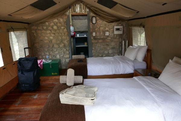 Das Sikereti Camp ist auf 35 Jahre gepachtet und wird von zwei Brüdern geführt. Wir treffen den Camp Manager Edwin Fernandez, dessen Eltern aus Goa nach Tansania emigriert sind. Sein Vater fand dann gute Arbeit in Sambia, wo Edwin zur Schule gegangen ist. Jetzt sehen die Brüder Namibia als ihre Heimat und die Lodge als ihre Altersversorgung. Was für eine Biographie.