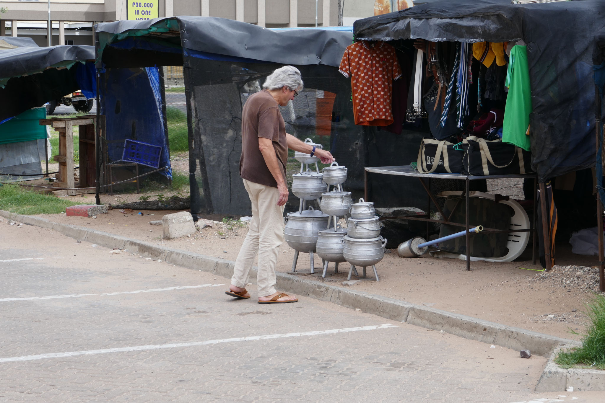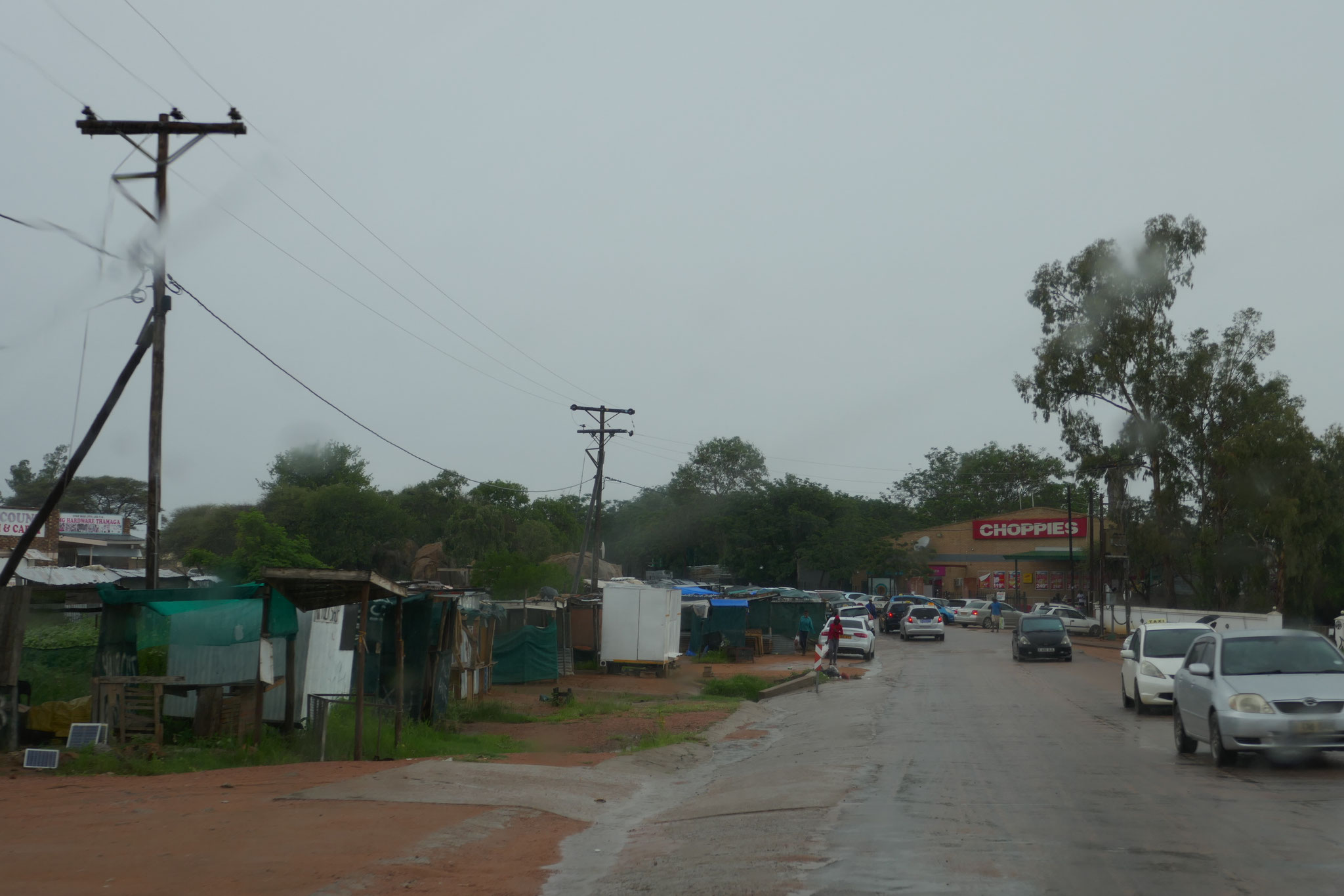 Sonne, leichter Wind, gewaltige, schöne Wolkenformationen am Himmel, dazu 33 Grad. Ein durcheinander gewürfeltes afrikanisches Dorf, Bankfiliale auf einem Trailer, Tankstelle, Post, einfacher Shoprite Supermarkt, hier ohne Klimatisierung, viele Buden, freundliche Wochenendstimmung.
