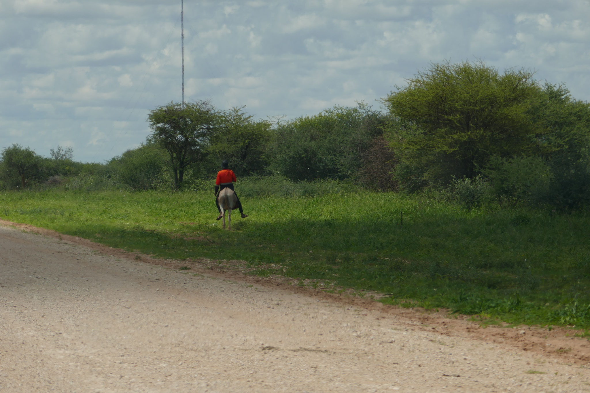 Aufstehen 4:30 Uhr, kleines Frühstück 4:45 Uhr, Abfahrt 5:15 Uhr. Zunächst durch dichtes Buschland, dann durch lichtes Buschland, dann durch Grasland mit vielen Pferden und Kühen und vereinzelten Häusern, dann einige Schritte auf dem gerade wieder tragenden Sand der Salzpfanne.