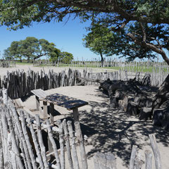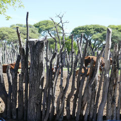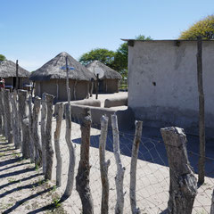 Die Lehmhäuser sind nach traditioneller Art mit einem Zaun aus dicken, in die Erde grammten Ästen abgegrenzt.