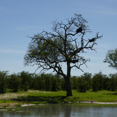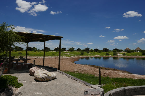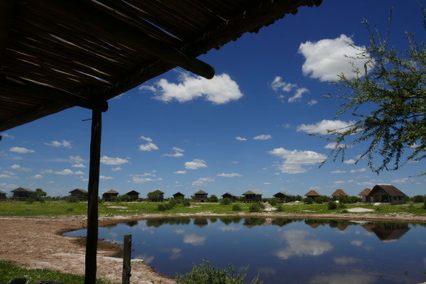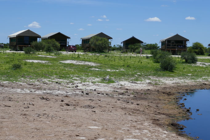 Der Nata Fluss führt Wasser, ein Wunder, wir haben ihn zweimal in der Vergangenheit zur gleichen Jahreszeit als Trockenbett erlebt. Pause und Mittagessen in der Nata Lodge,im Schatten grosser Bäume, geplegt, schöne, geräumige Hütten auf Stelzen. Zwei Motorradfahrer mit dänischem und schwedischem Kennzeichen machen auch Mittagspause.