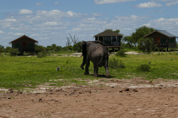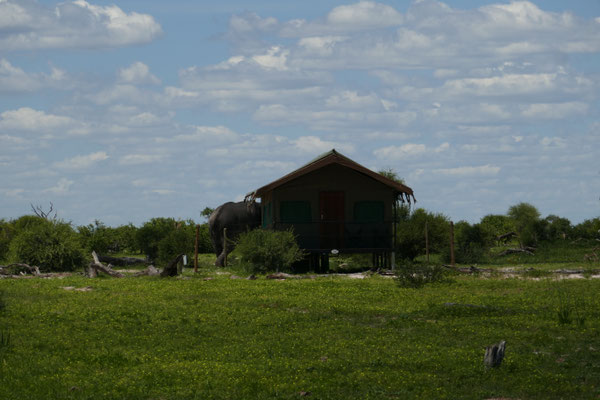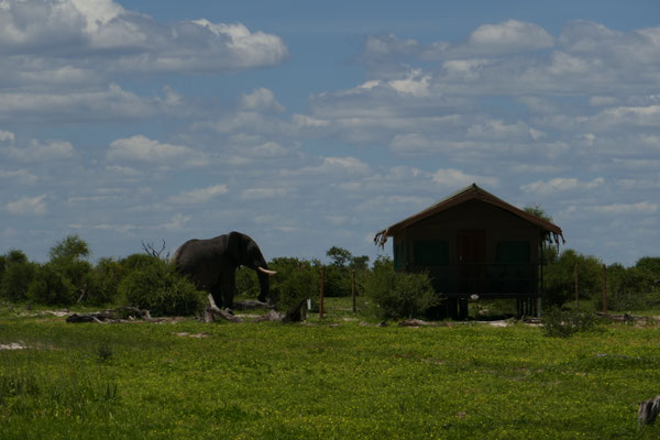 bleibt noch über Nacht in einem der Nachbarzelte, eine jüngere Gruppe bleibt auf dem Zeltplatz. Die Elefanten bleiben im Busch.