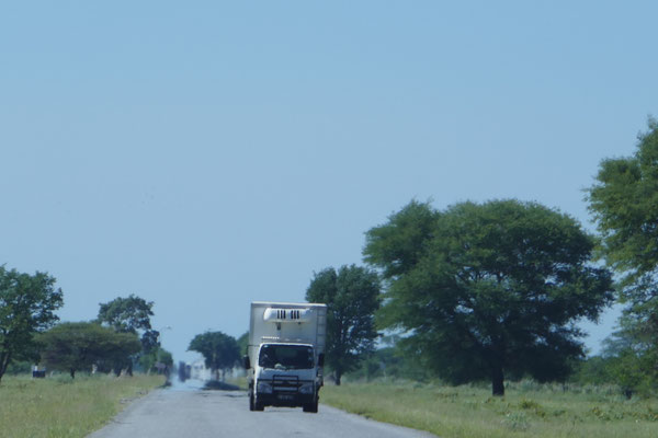 Sind ja nur 250 Kilometer von Elephant Sands bis Francistown, dauern aber so 3,5 Stunden. Denn oft tauchen ganz unverhofft Schlaglöcher auf, die umfahren werden möchten und an einigen Stellen sind so viele Schlaglöcher nebeneinander, dass der Weg dran vorbei über eine Sandspur neben der Strasse führt. Alles gut machbar, wenn man 60 - 70 km/h fährt und rechtzeitig abbremsen kann. Die Strecke wird von vielen LKWs, die im Transit fahren, benutzt. Die gefühlte Hälfte von ihnen ist chinesischer Bauart.