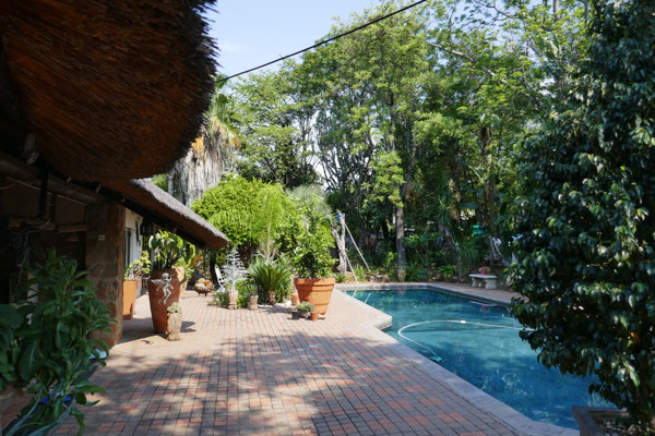 Strasse auf beiden Seiten 20 Meter öffentlicher Streifen mit Gräsern und vereinzelten Bäumen. Erst dahinter liegen die Zäune der Farmen. Ziel erreicht: Oasis Lodge. Die hatten wir vor ein paar