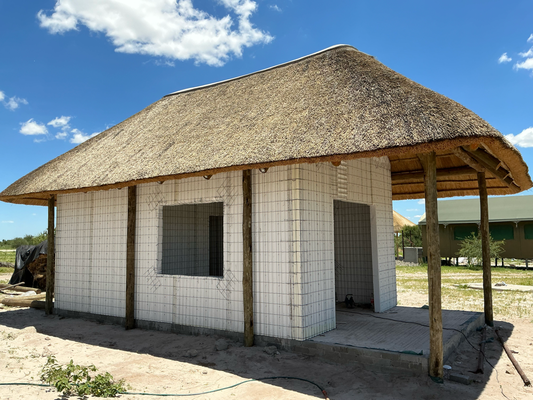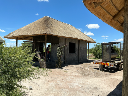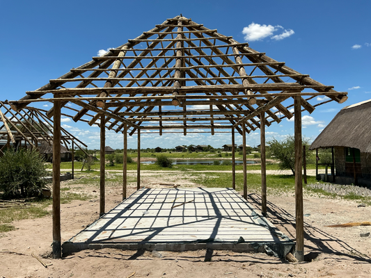 Super unter dem grossen Moskitonetz geschlafen. Auf dem Gelände der Lodge werden neue Unterkünfte gebaut. Gelegenheit, um afrikanischen Hausbau zu