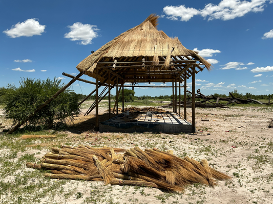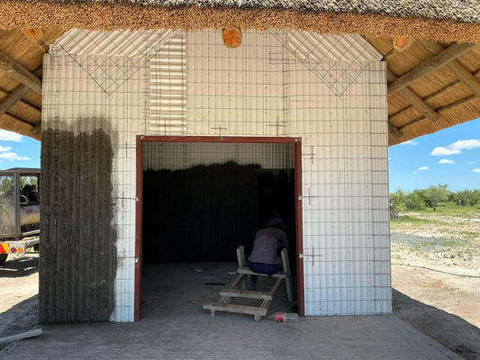 Ausserhalb, direkt am Ringanker, werden Holzstämme eingebuddelt, die dann auch das Dach tragen, das mit Reed gedeckt wird.