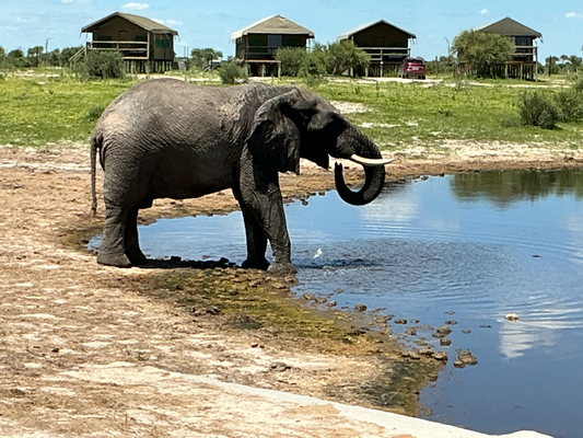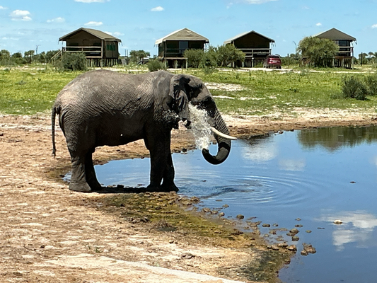 20 Minuten über sandige Pisten entfernt kommen wir zu einem einsamen Selbstversorger Camp tief im Busch. Gehört auch zu Elephant Sands. Voll ausgestattete gemeinsame Küche, Zelte mit zwei separaten Betten, angegliederte Nasszelle, einfach und gut. Wer 6 Gäste zusammenbringt, mietet das ganze Camp exclusiv. Hier hört man nichts von der Durchgangsstrasse, die nachts in Elephant Sands zu hören ist. Wir sehen ein paar Impalas und einen Elefanten. Mittags an unserem Wasserloch haben wir 36 Grad Luftthemperatur, das hält kein Elefant aus, da muss geduscht werden: