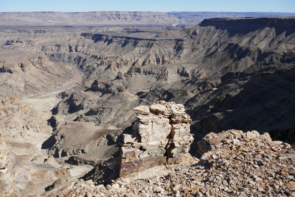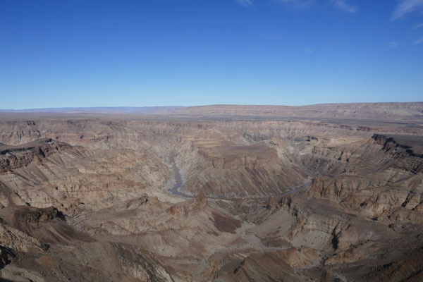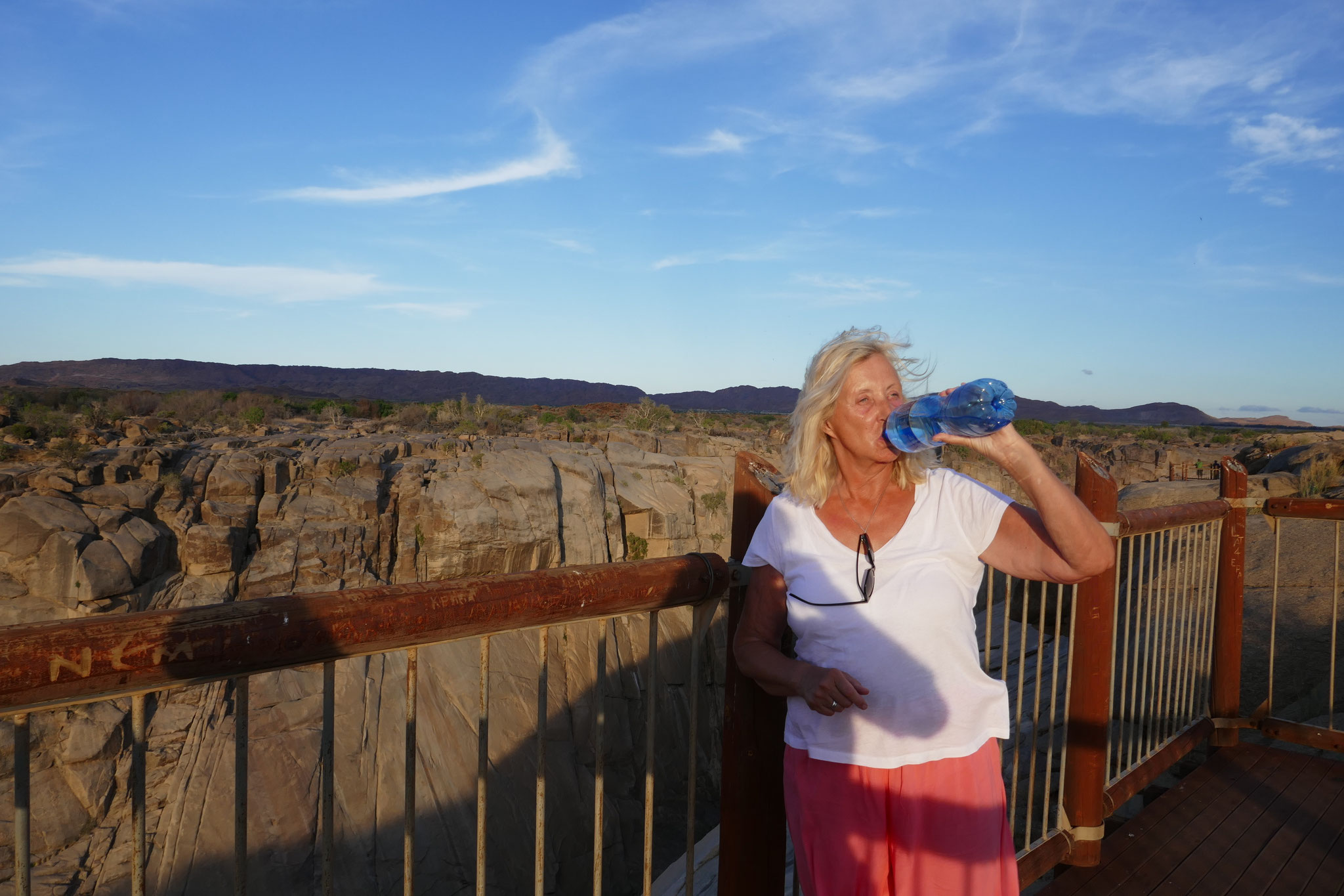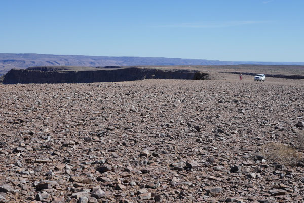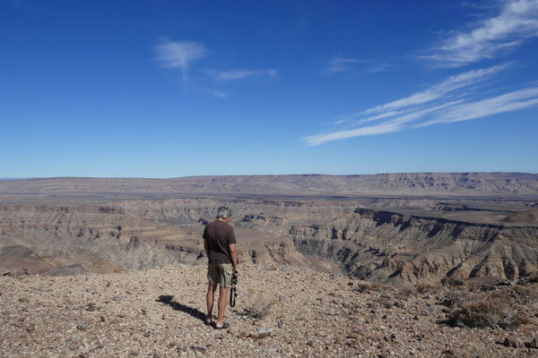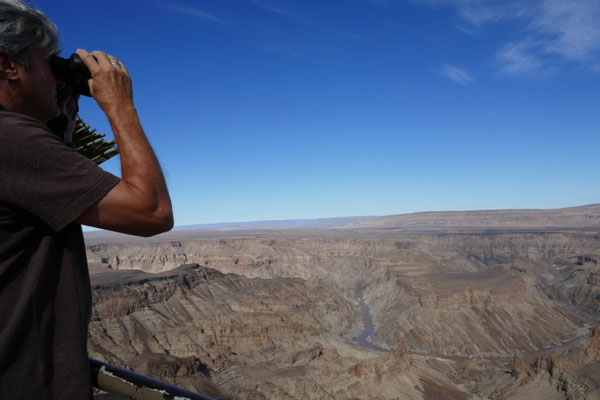Super Frühstück, freundliche Bedienung, Sonnenschein, das macht gute Laune! Wir fahren 20 Kilometer zur eigentlichen Attraktion dieser Gegen, dem Fish River Canyon. Vom Aussichtspunkt blicken wir in eine tiefe Schlucht mit einem wenig gefüllten Fluß ganz unten drin. Gewaltig, ja, aber überwältigt sind wir nicht. Dafür muß man sich vielleicht der geführten 4 Tages Wandertour anschließen und mal runtersteigen. Nichts für uns. Wir laufen am Rand des Canyons entlang, immer wieder schöne Ausblicke, aber außer ein paar Schwalben kein einziges Tier in dieser überaus kargen Landschaft.