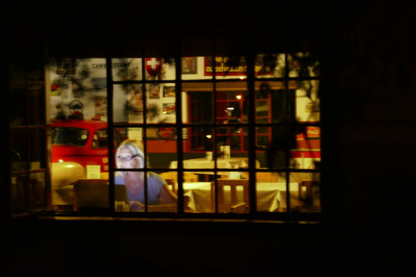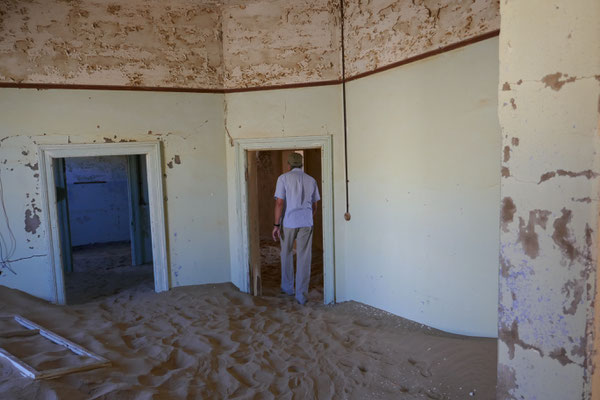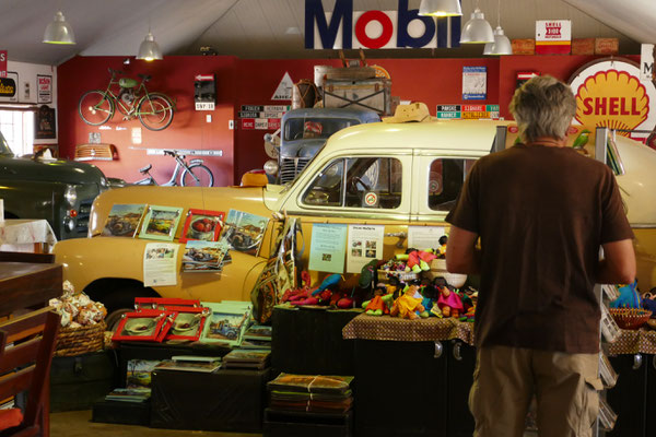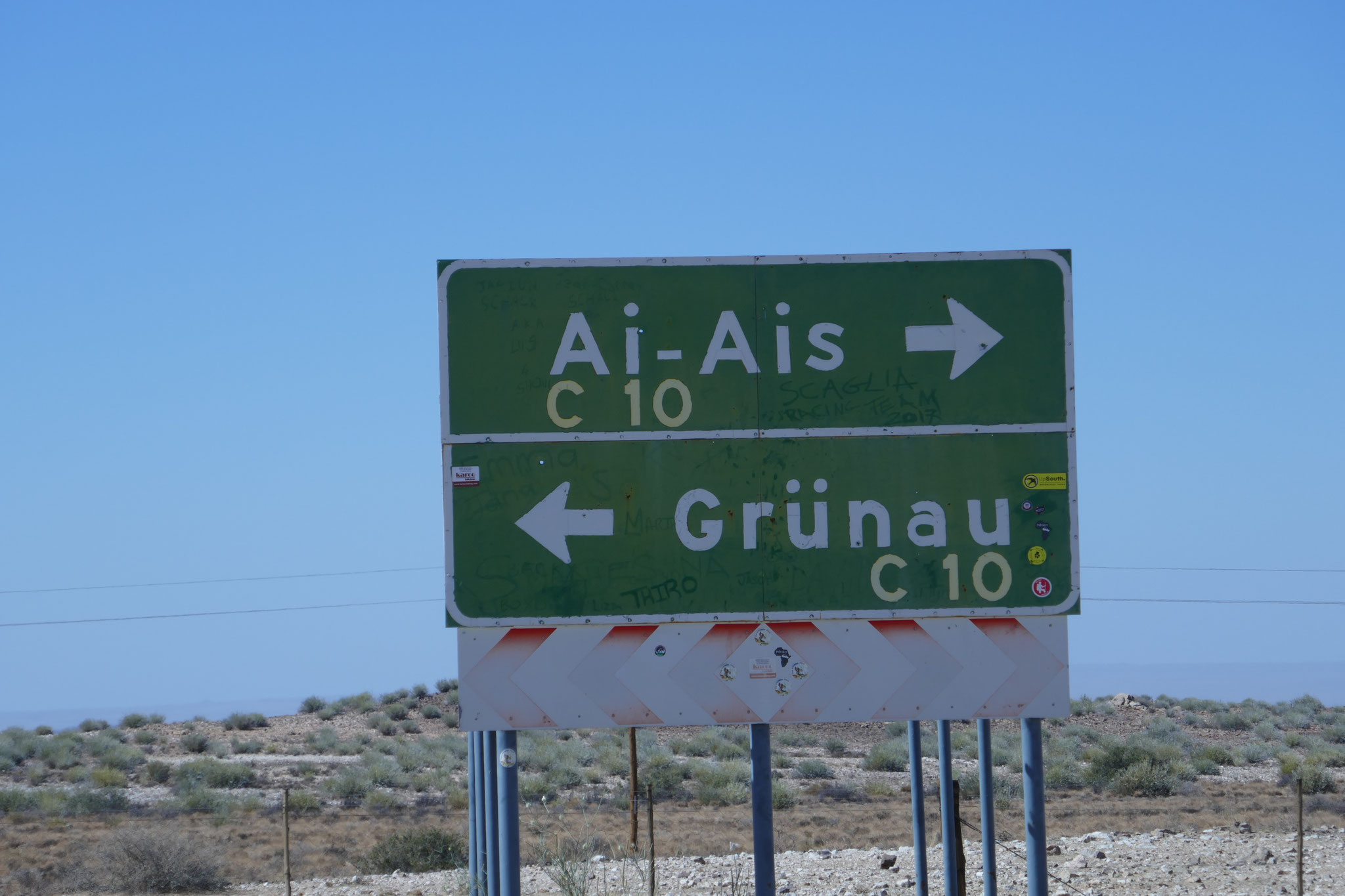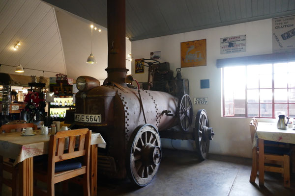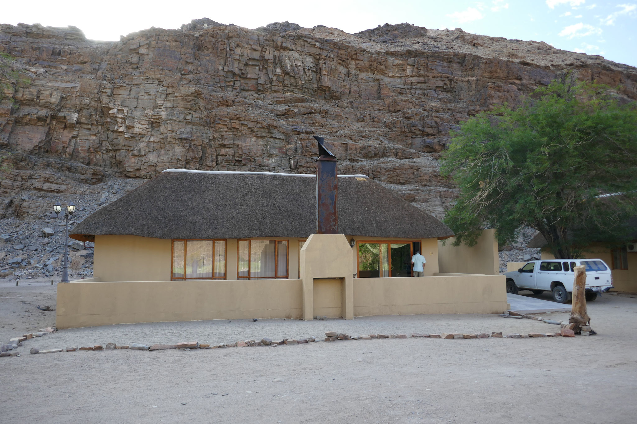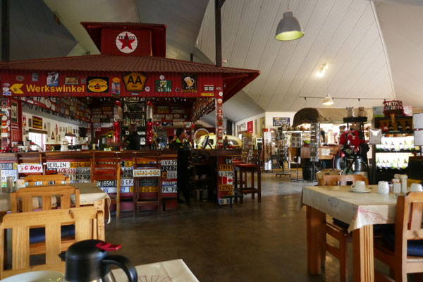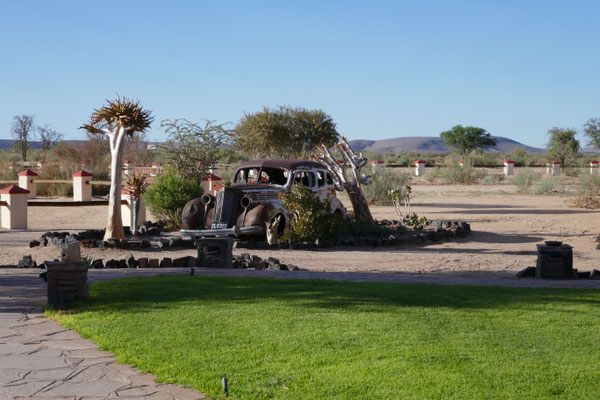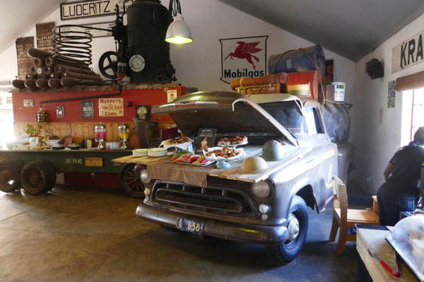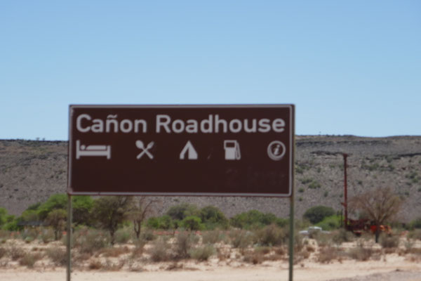 Wir fahren in viereinhalb Stunden von Lüderitz zum Fish River Canyon. Erst Asphalt, dann eine fürchterliche Waschbrettpiste. Mittagspause im Seeheim Hotel, allein, mitten im Nichts. Bratwurst, Pommes, griechischer Salat. Wir sind in deutsch-Südwest. Das Hotel sieht aus wie eine Burg, liegt toll am Hang, unten die alte Bahnstation, rumherum Ödnis. Ein paar Kühe kommen an den Pool und saufen. Auf der Weiterfahrt kommt uns ein Zug entgegen, ja, in Namibia gibt es nicht nur Schienen, erstmalig sehen wir einen Zug in Action. Der Lokführer gibt dreimal Signal, das erwidern wir mit der Hupe. Wir bleiben im Canyon Roadhouse, eine große Halle mit vielen alten Autos und dazwischen Rezeption, Tische, Bar, super gemacht. Daneben ebenerdige Häuser mit den Zimmern. Wir freuen uns, fühlen uns wohl, bleiben zwei Tage. Und probieren Oryx (lecker, etwas festeres Fleisch, angenehm intensiv im Geschmack) und Springbock (lecker, nicht ganz so festes Fleisch, weniger intensiv im Geschmack), Wild, also ohne Hormone usw., äußerst mager.
