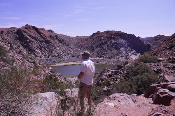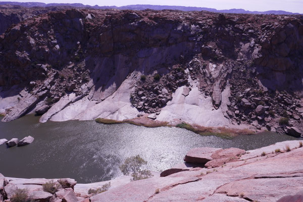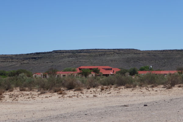 Vom Canyon Roadhouse sind es 70 Kilometer bis zur 60 Grad warmen, schwefelhaltigen Heilquelle von Ai Ais. Ai Ais liegt wie tot da, den meisten potentiellen Besuchern sind die Lufttemperaturen in diesen Monaten zu hoch. Ab April ist das Heilbad nahezu ausgebucht. Wir freuen uns auf eine Erfrischung im großen mit Heilwasser gefüllten Schwimmbad draußen. Das ist auch die ganze Nacht über geöffnet, da können wir den Sternenhimmel über uns bestaunen. Kalle hatte uns den Tipp gegeben. Aber: die Umwälzpumpe ist vor ein paar Tagen kaputt gegangen, im Schwimmbad steht nur eine Restpfütze, am Boden viel Sand. Wo wir auch fragen, Informationen gibt es nicht. Nicht über das Heilwasser, nicht über die Qualität des Wassers im Indoor Pool. Der hatte Badewannentemperatur, aber kein Heilwasser. Wasserhähne lose, Damentoiletten verdreckt, Badehandtücher schmuddelig, ein staatliches Bad von seiner häßlichen Seite.