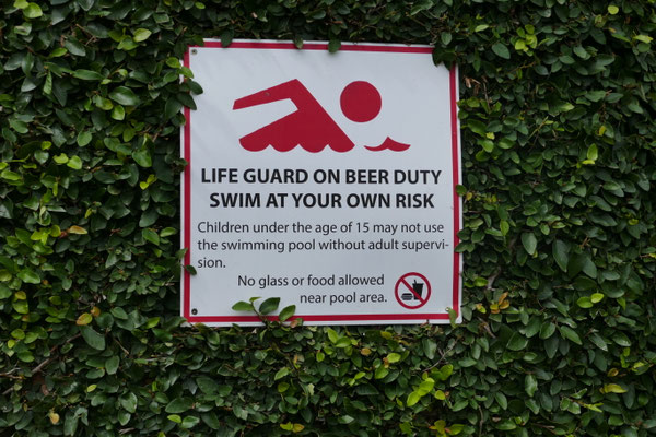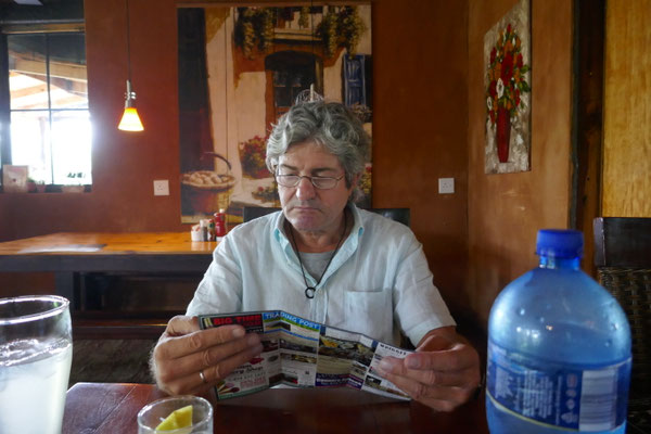 Als ich aus der Dusche komme zeigt mir Ruth Affen auf unserer Terrasse und mahnt zur Vorsicht. Ich bitte sie, sich umzudrehen, da sitzt bereits ein Affe drinnen auf der Arbeitsplatte der Küchenzeile. Ruth verscheucht ihn, er bleibt aber oben auf der Eingangstür sitzen, dreht sich um und macht aggressive Gesten, springt Ruth immer wieder an. Erst als Ruth die in der Nähe stehende Grillkohletüte greift und bedrohlich schwingt, gibt er auf. Gut, dass ich mit einer Großwildjägerin reise, Judo hätte vielleicht doch nicht geholfen, Affenabwehr haben wir noch nicht trainiert.(Und mein mutiger Ehemann ist mir natürlich auch nicht zur Hilfe geeilt!)